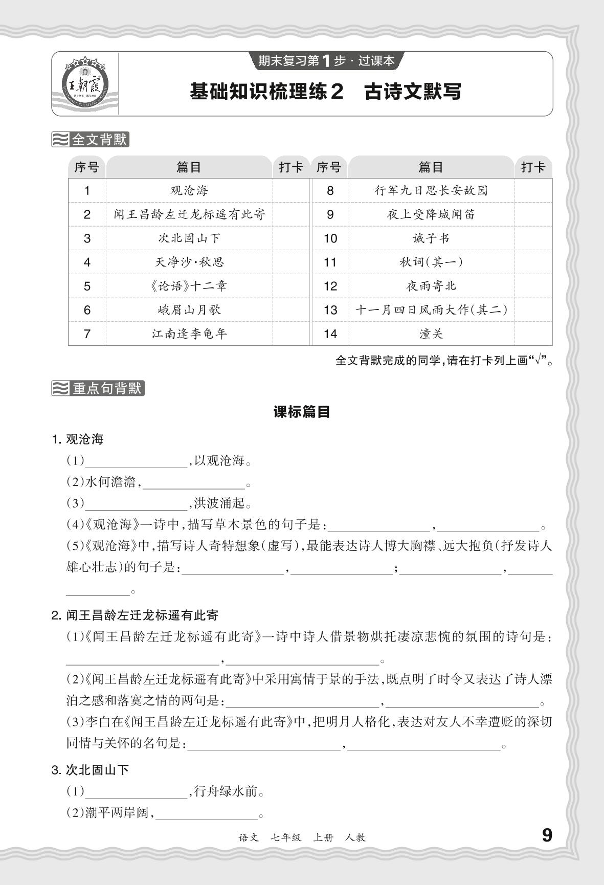2023秋上册七年级语文人教版 期末过课本·基础知识梳理练 古诗文默写【2】
