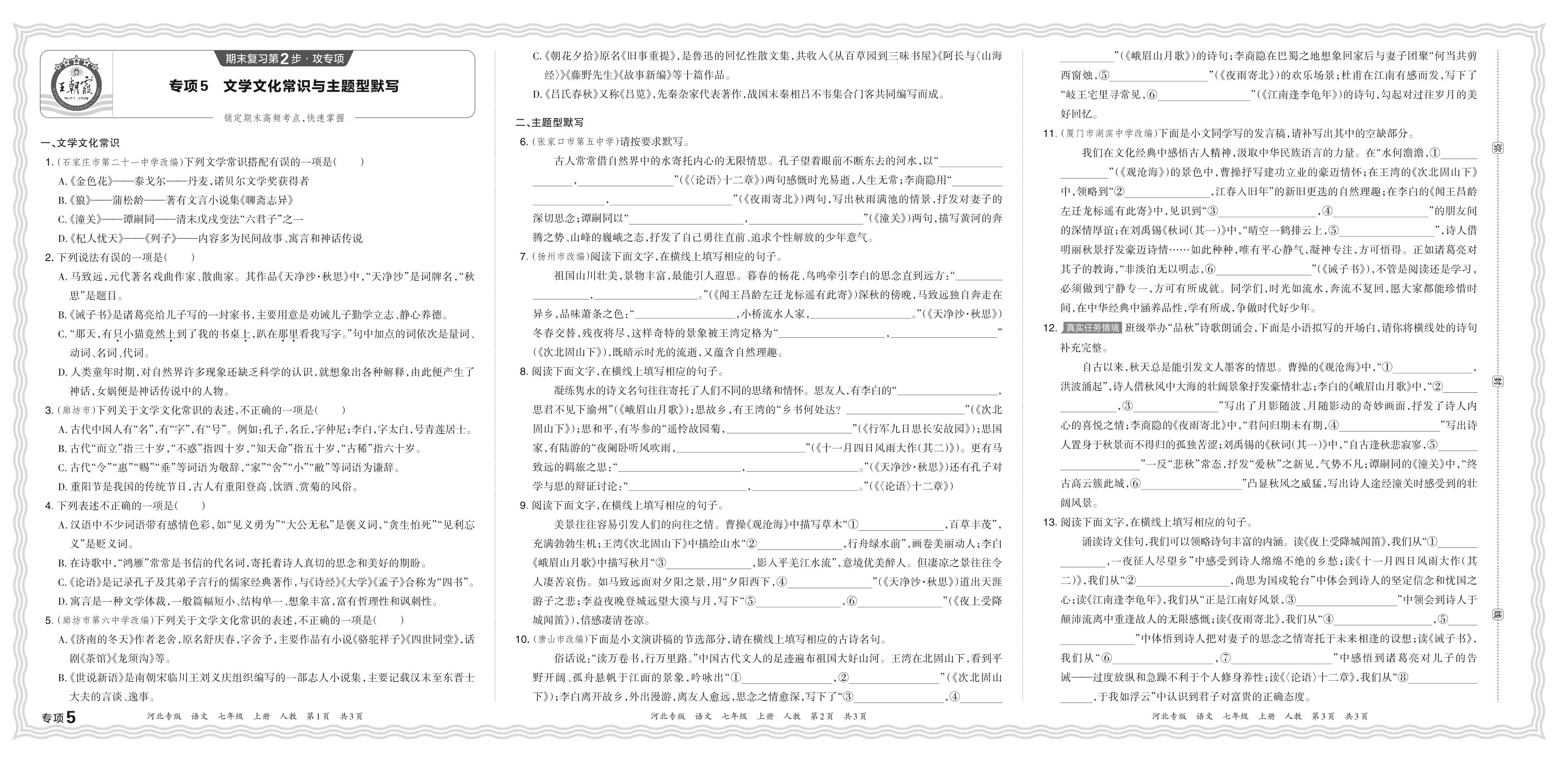 2023秋上册七年级语文人教版 期末专项卷·文学文化常识与主题型默写【5】