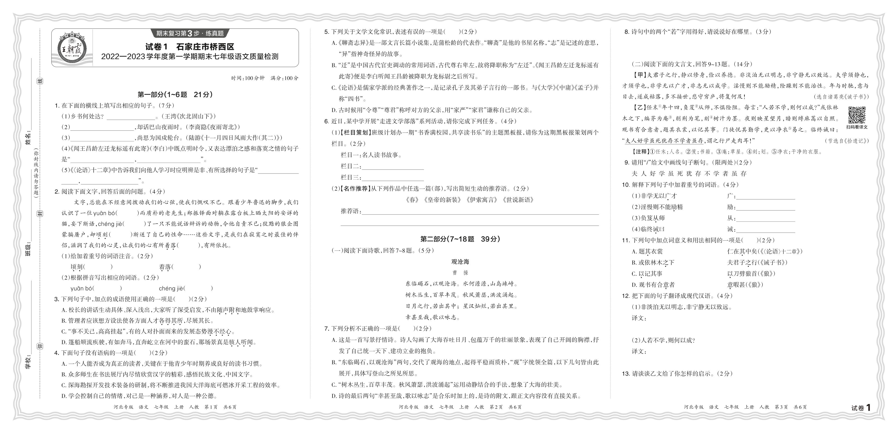 河北省石家庄市桥西区2022—2023学年度第一学期期末七年级语文质量检测(人教版)【1】