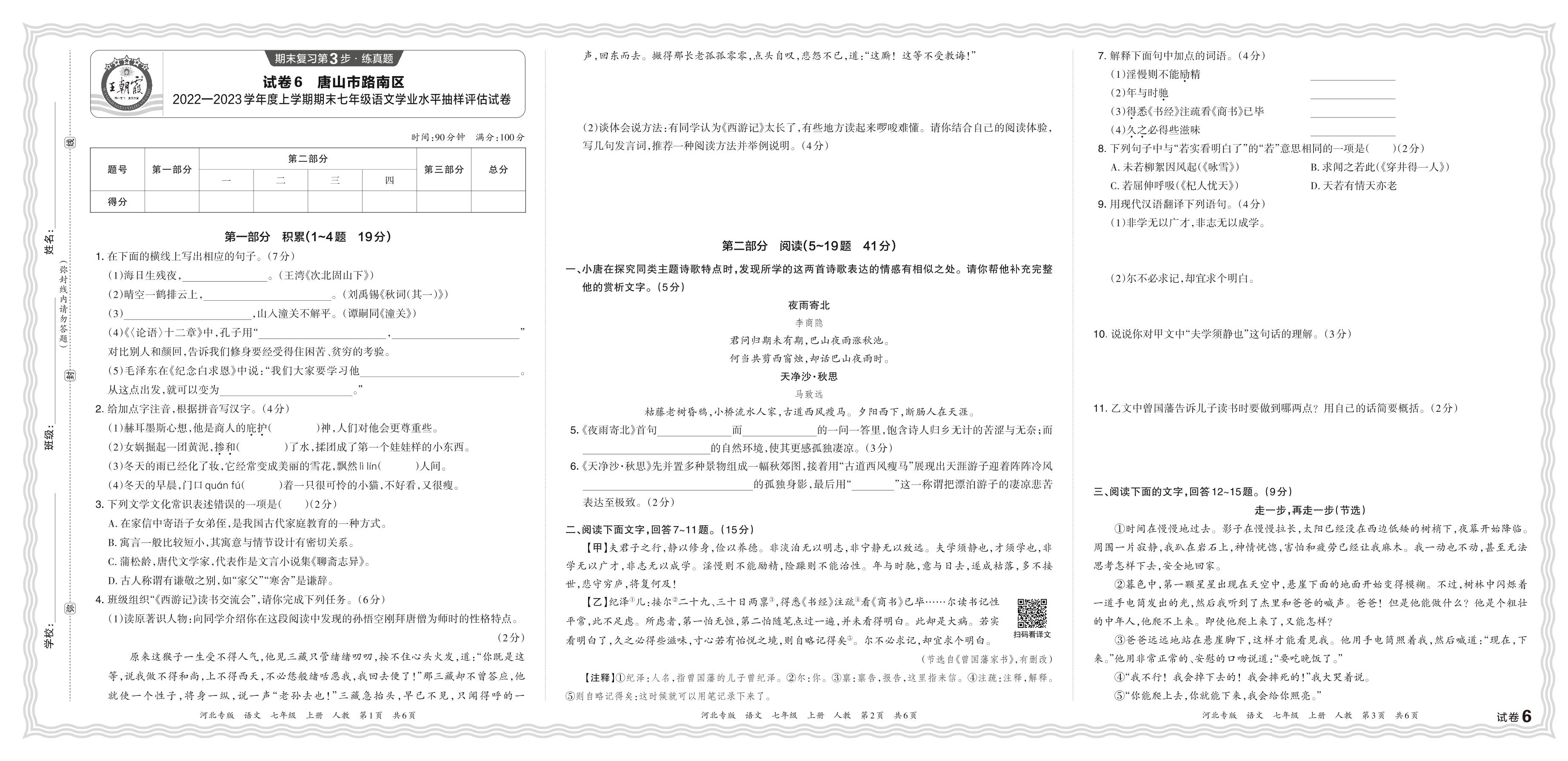 河北省唐山市路南区2022—2023学年度上学期期末七年级语文学业水平抽样评估试卷(人教版)【6】