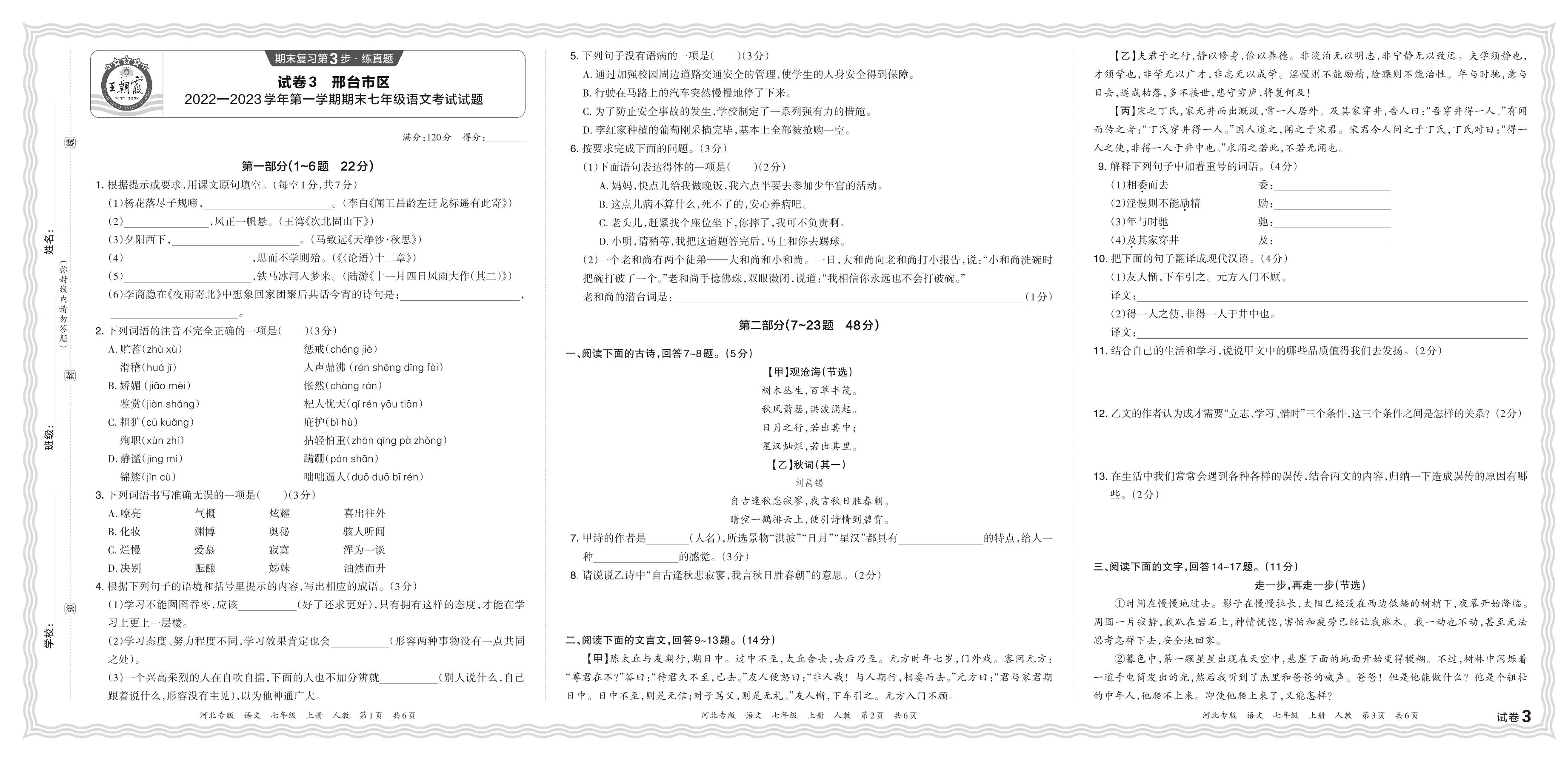 河北省邢台市区2022—2023学年第一学期期末七年级语文考试试题(人教版)【3】
