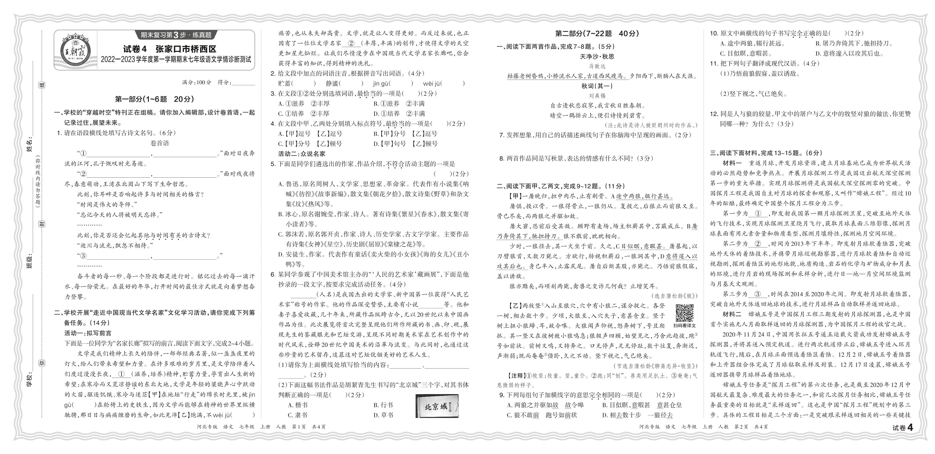 河北省张家口市桥西区2022—2023学年度第一学期期末七年级语文学情诊断测试(人教版)【4】