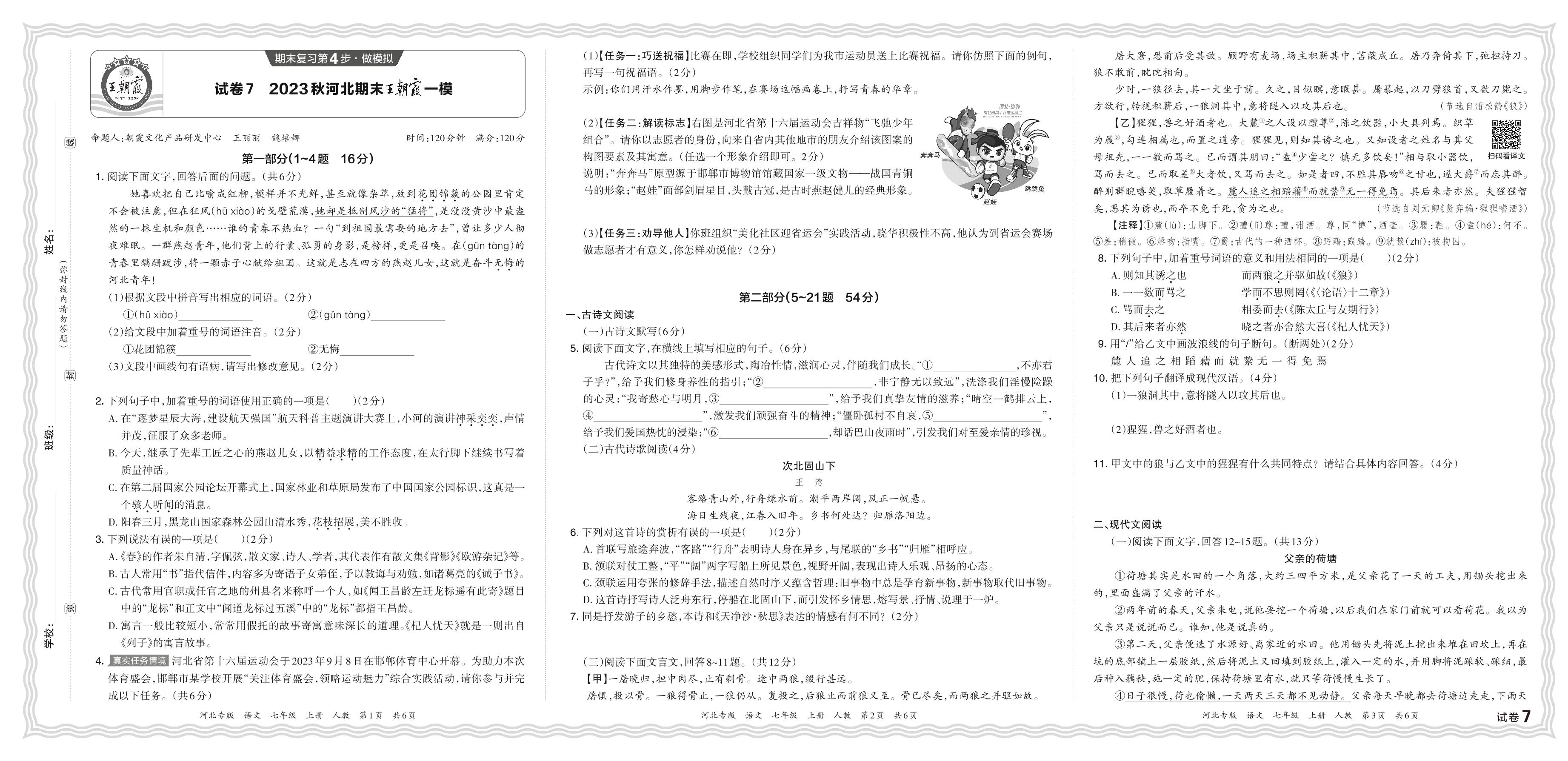 2023秋上册七年级语文人教版 河北期末王朝霞一模