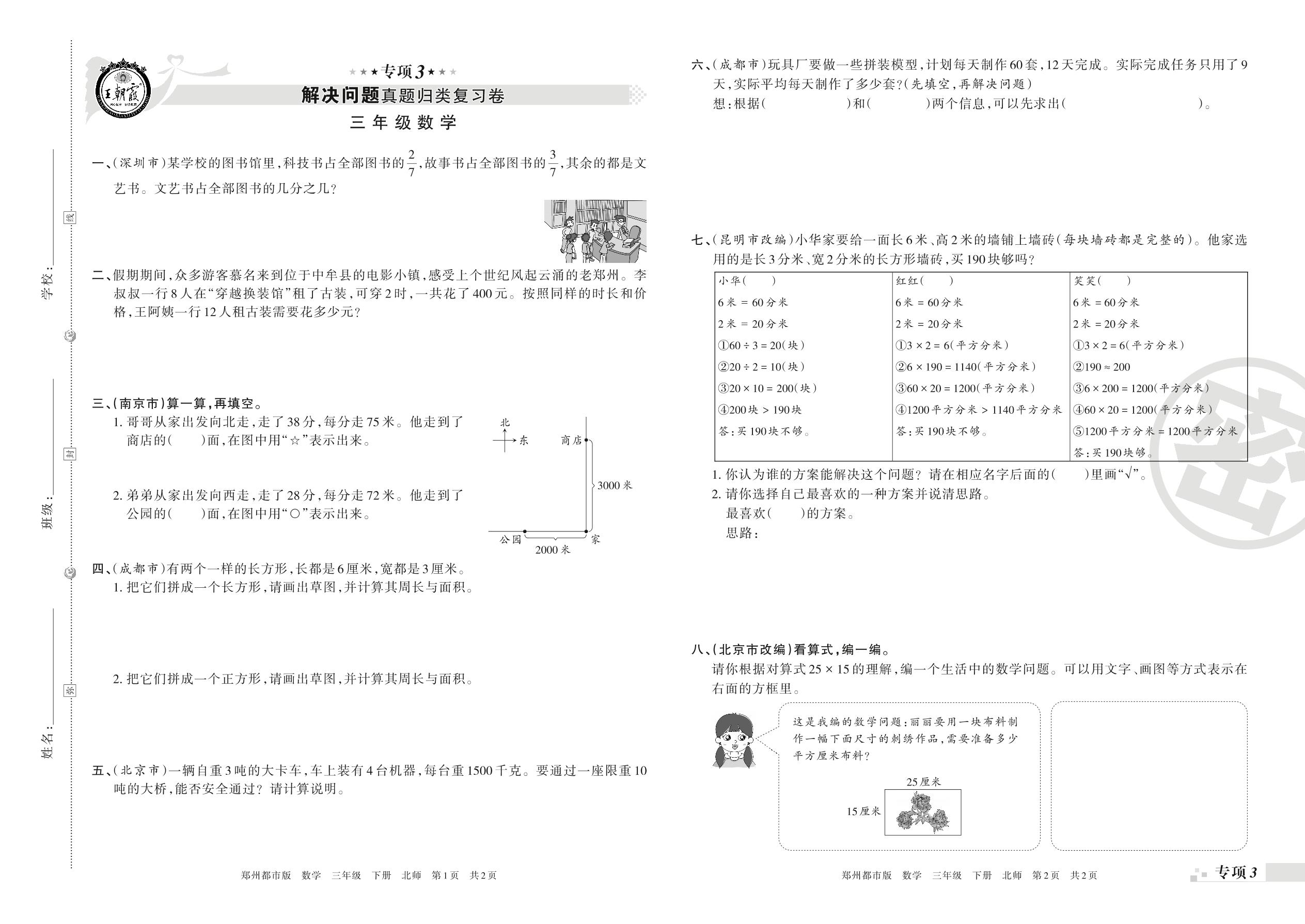 王朝霞期末专项卷——解决问题真题归类复习、新颖题速递:生活与数学三年级下册数学(北师版)_R21080484152【0】