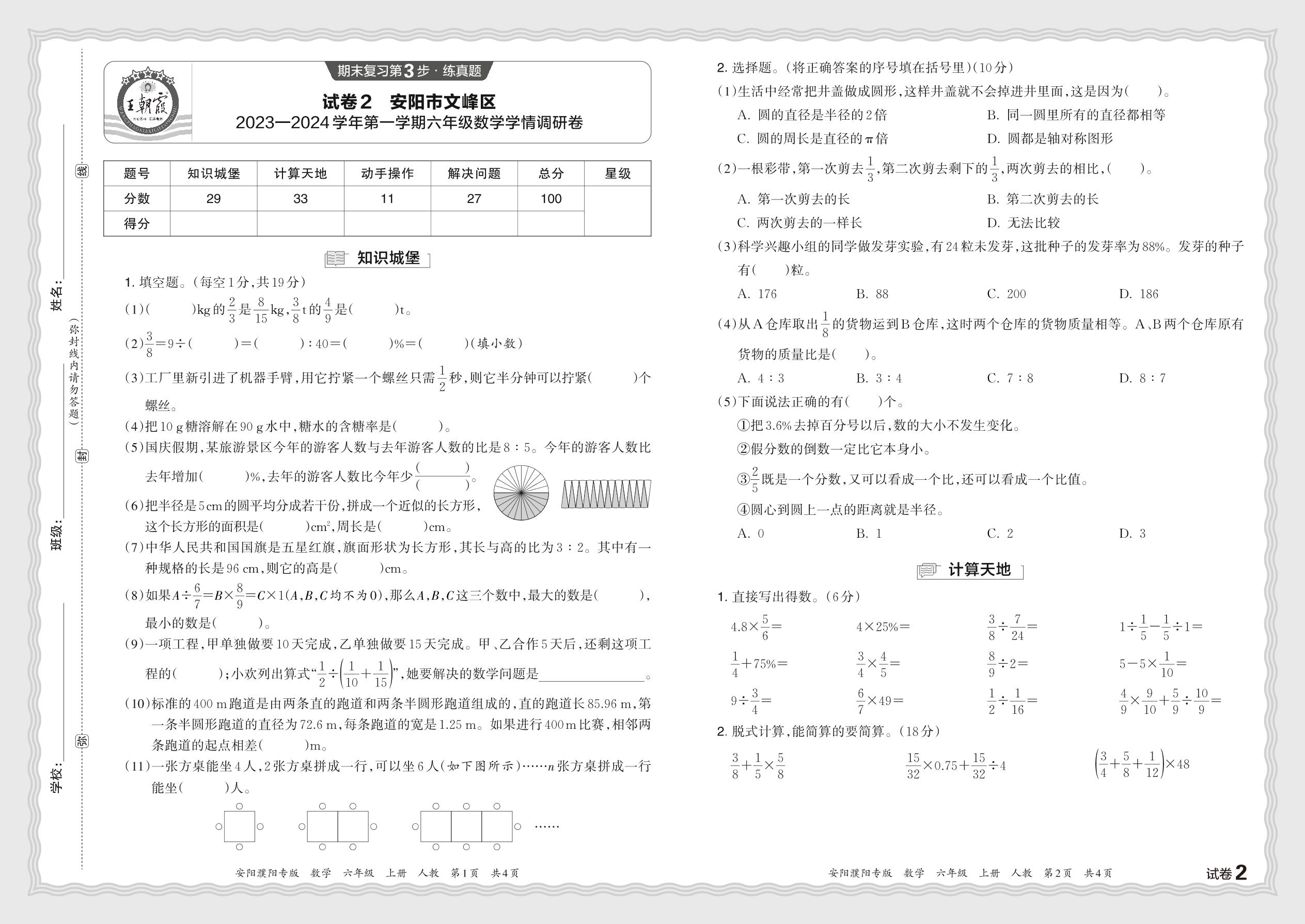 河南省安阳市文峰区2023—2024 学年第一学期六年级数学学情调研卷(人教版)【2】