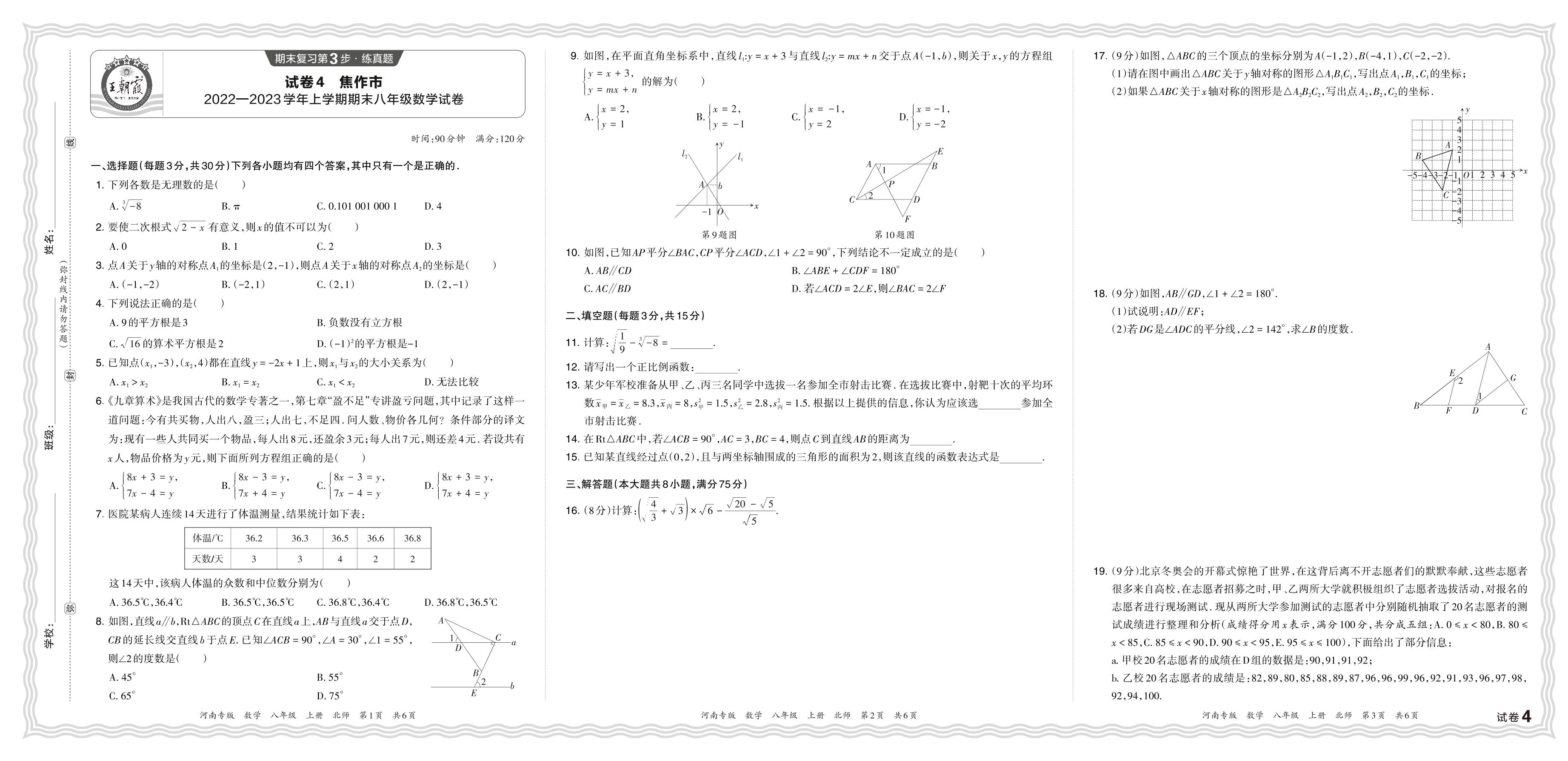 河南省焦作市2022—2023学年上学期期末八年级数学试卷(北师版)【4】