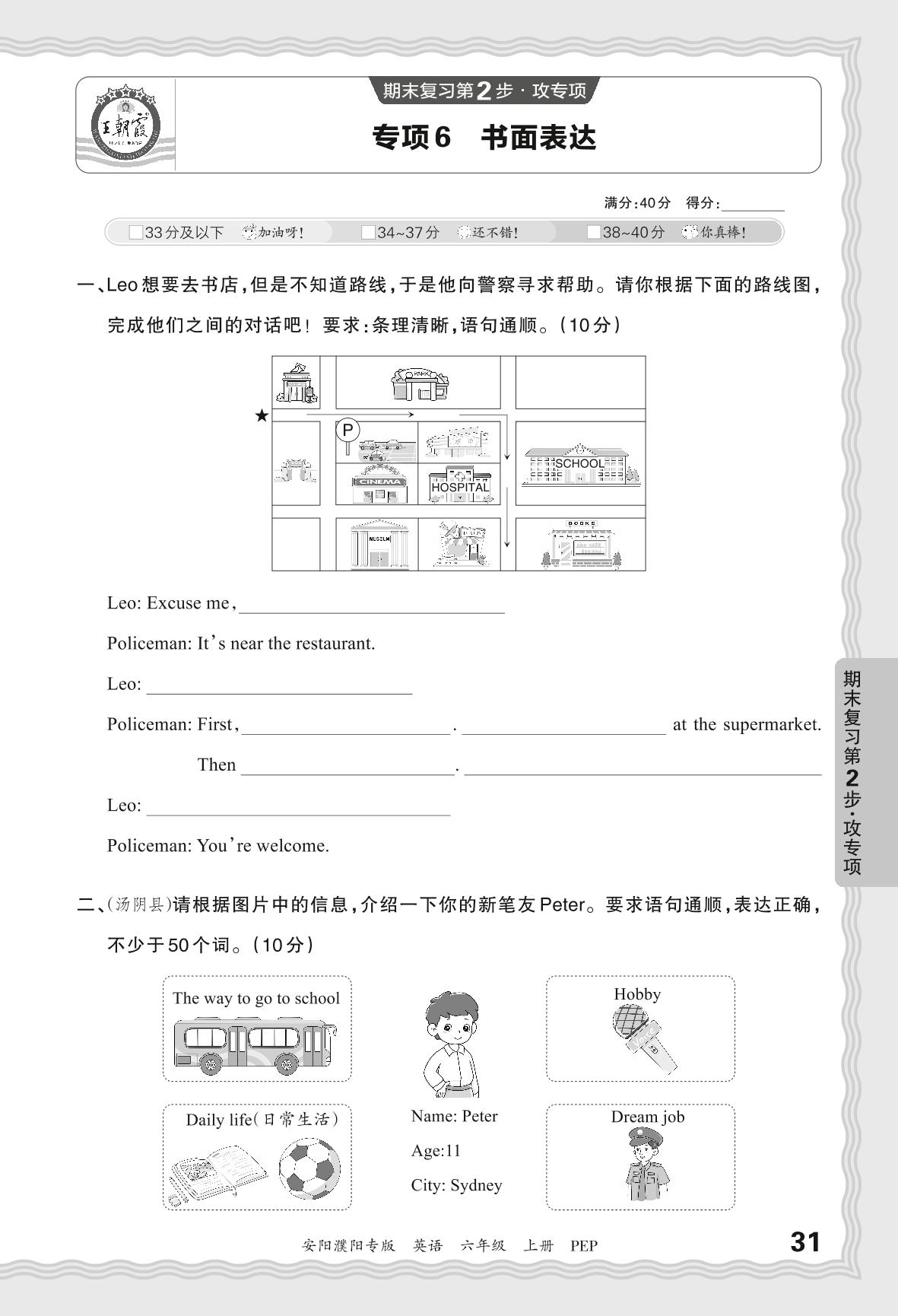 2023秋上册六年级英语人教PEP版 期末专项卷·书面表达【6】