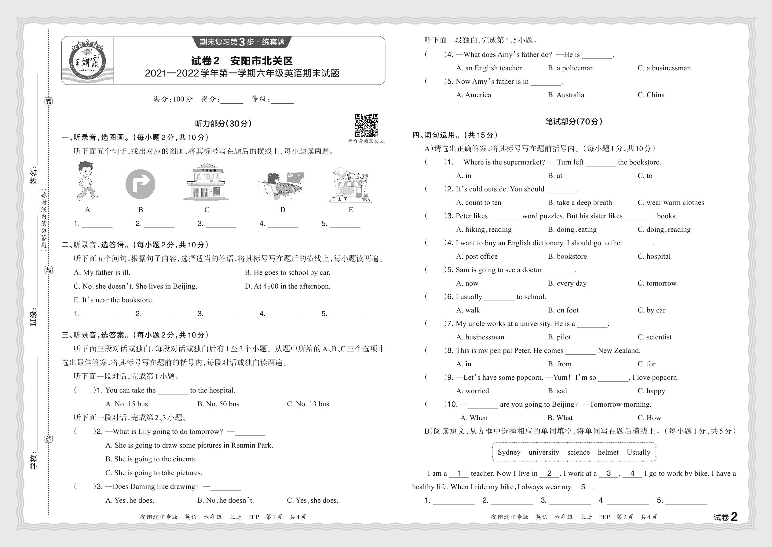 河南省安阳市北关区2021—2022学年第一学期六年级英语期末试题(人教PEP版)【2】