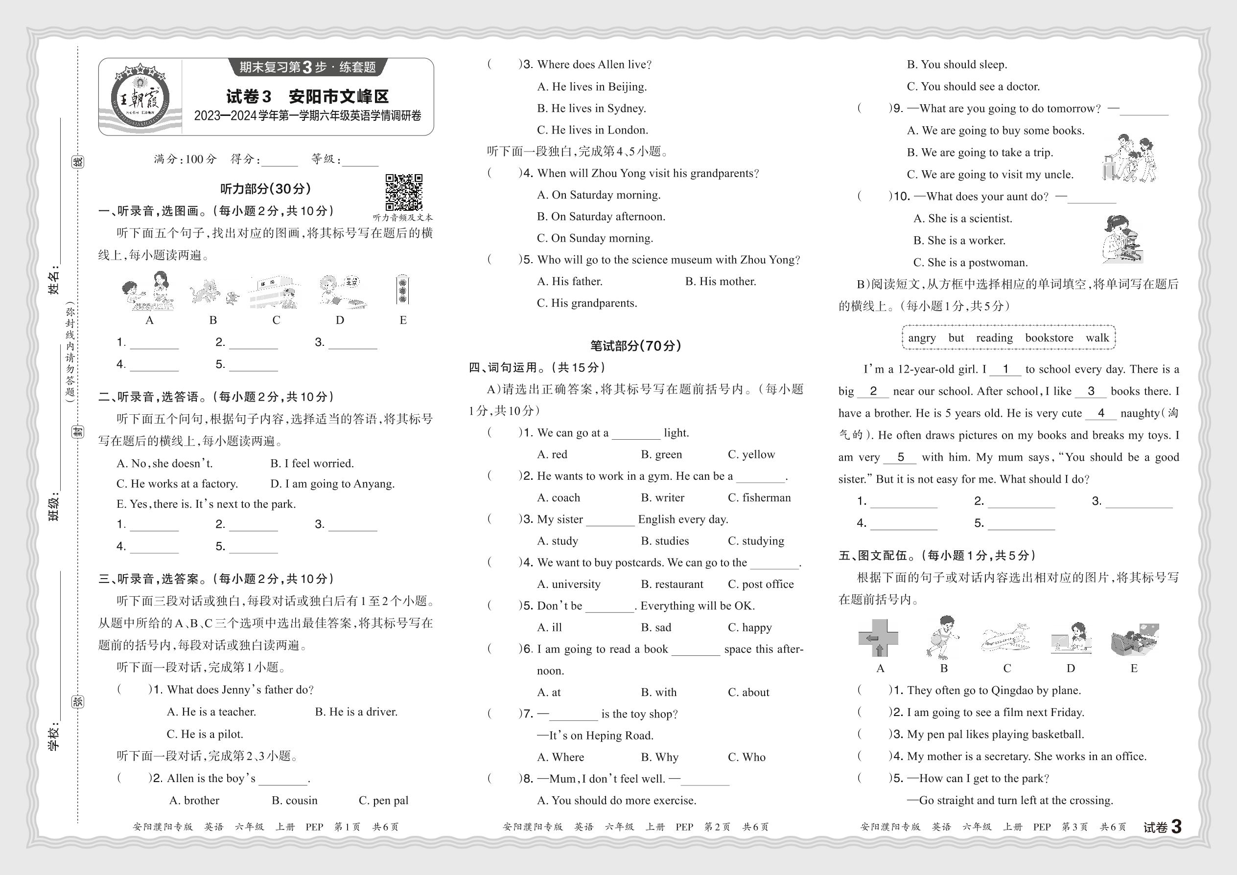 河南省安阳市文峰区2023—2024学年第一学期六年级英语学情调研卷(人教PEP版)【3】