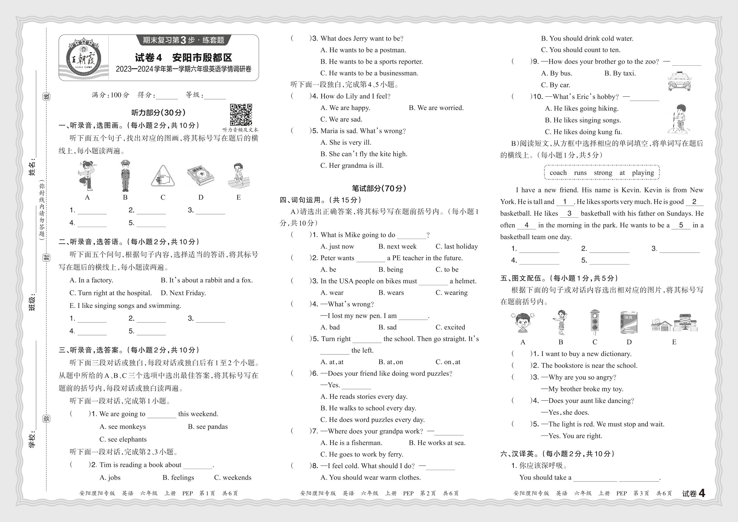 河南省安阳市殷都区2023—2024学年第一学期六年级英语学情调研卷(人教PEP版)【4】