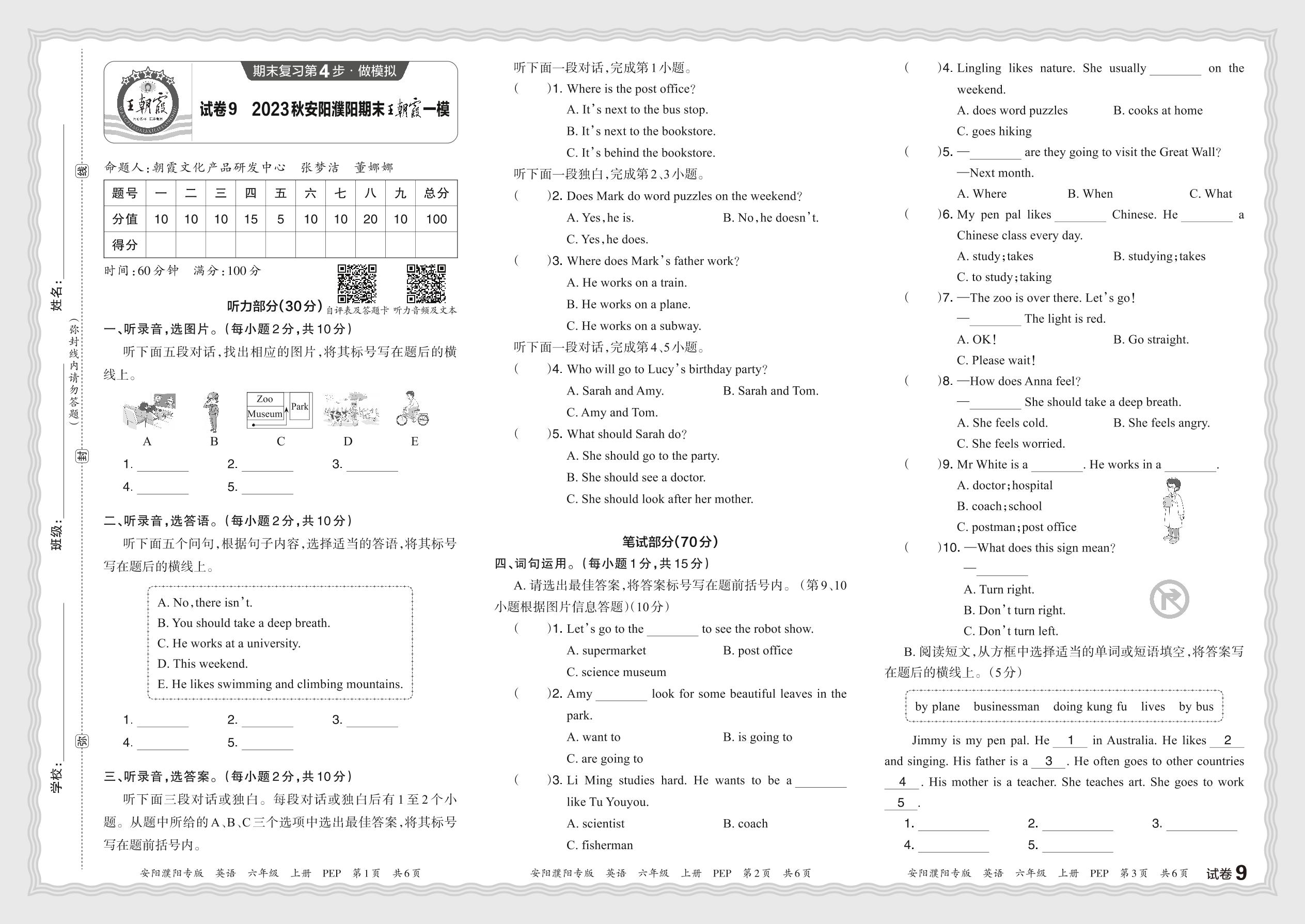 2023秋上册六年级英语人教PEP版 河南安阳濮阳期末王朝霞一模【9】