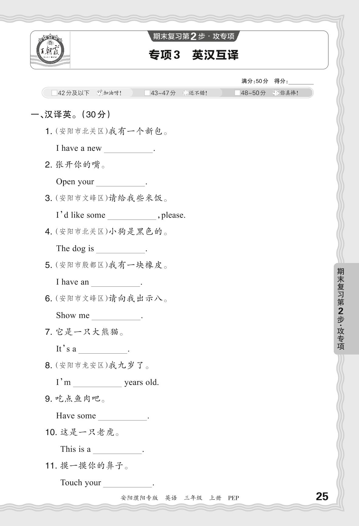 2023秋上册三年级英语人教PEP版 期末专项卷·英汉互译【3】