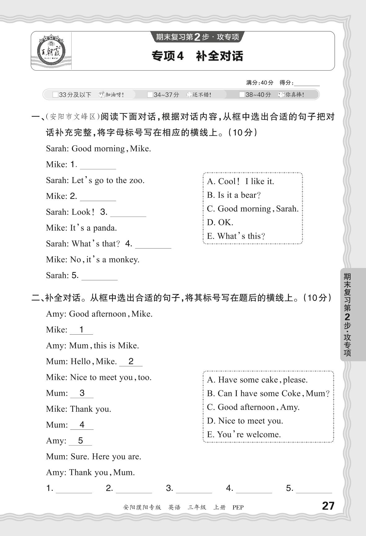 2023秋上册三年级英语人教PEP版 期末专项卷·补全对话【4】