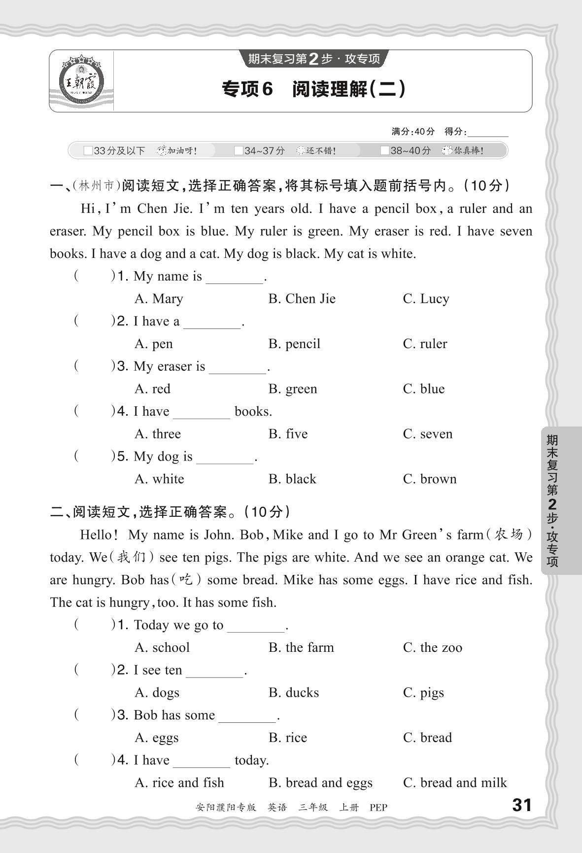 2023秋上册三年级英语人教PEP版 期末专项卷·阅读理解(二)【6】