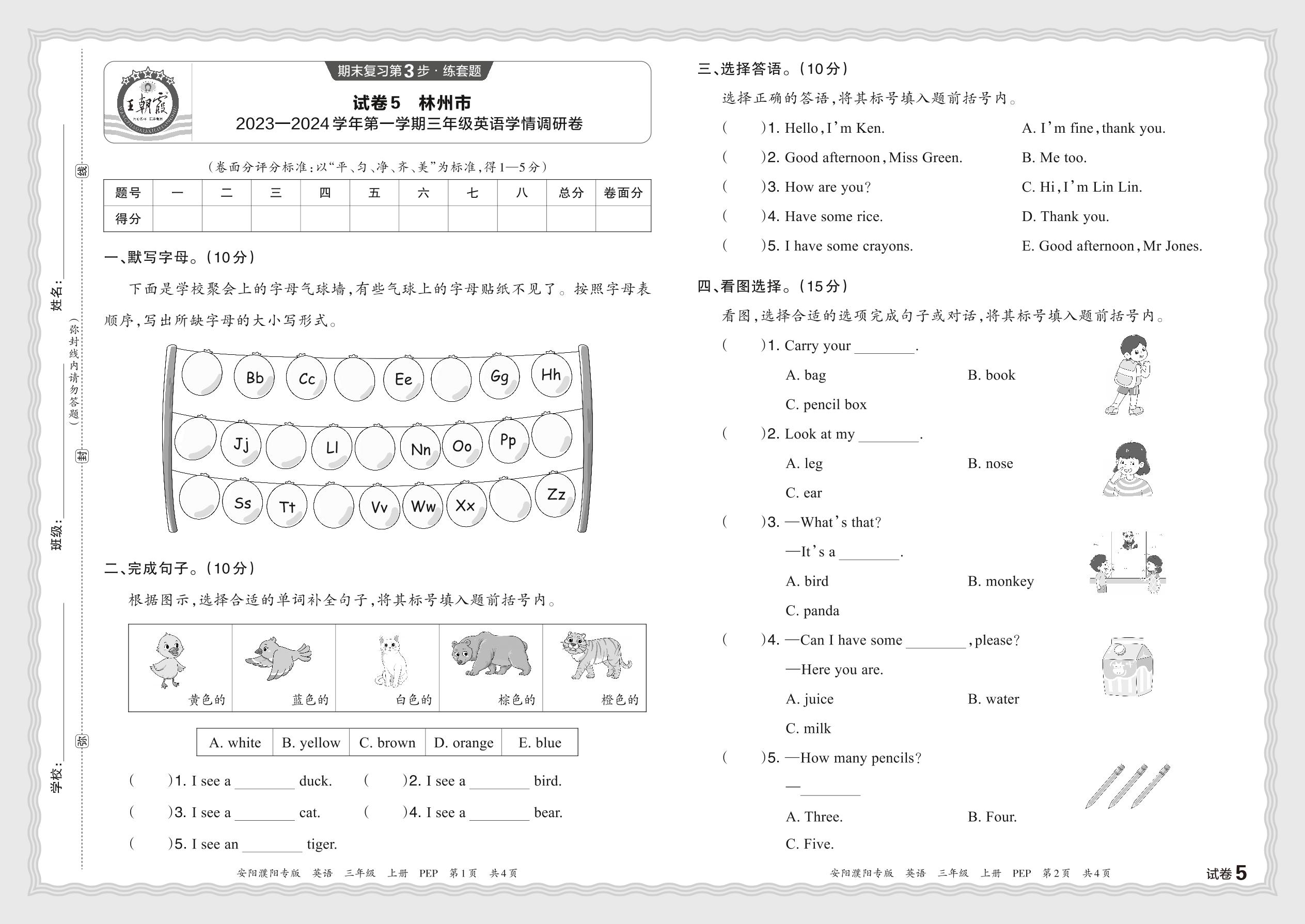 河南省安阳市林州市2023—2024学年第一学期三年级英语学情调研卷(人教PEP版)【5】