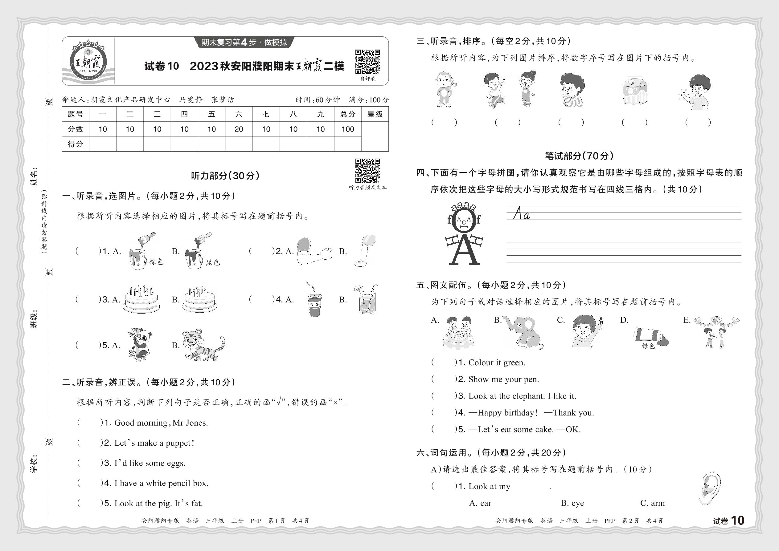 2023秋上册三年级英语人教PEP版 河南安阳濮阳期末王朝霞二模【10】