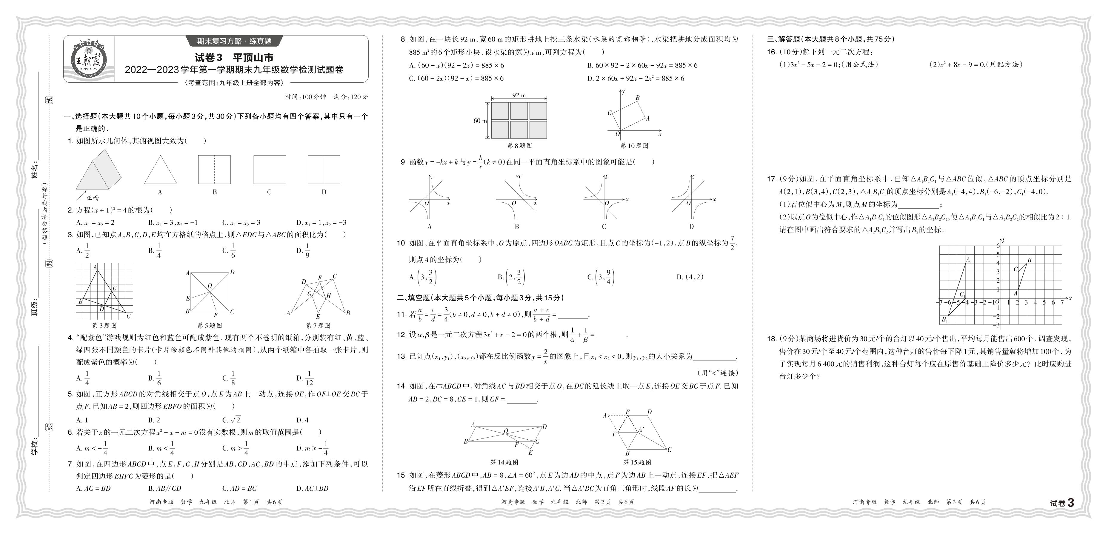 河南省平顶山市2022—2023 学年第一学期期末九年级数学检测试题卷(北师版)【3】