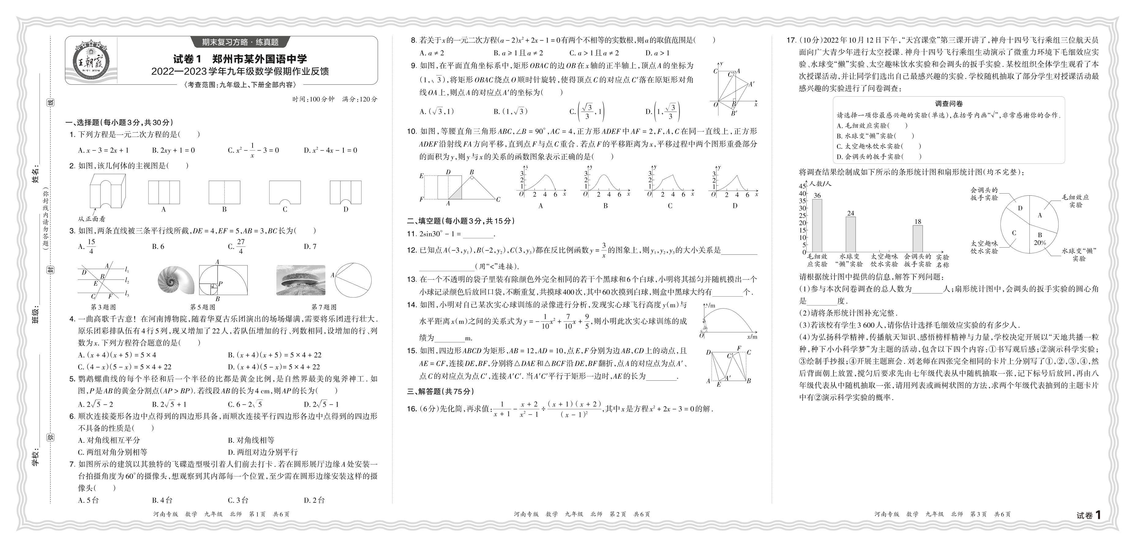 河南省郑州市某外国语中学2022—2023学年九年级数学假期作业反馈(北师版)【1】