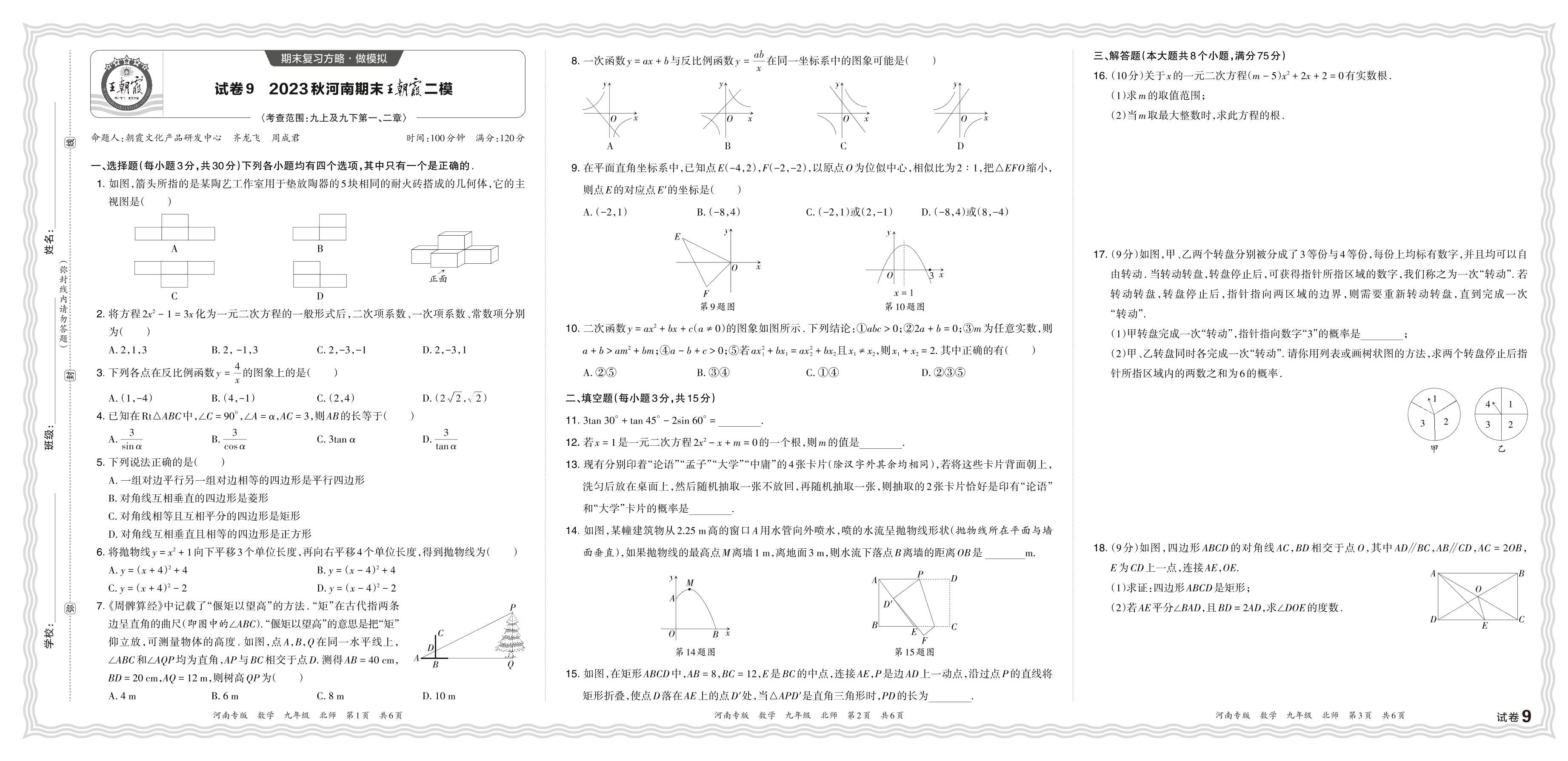 2023秋上册九年级数学北师版 河南期末王朝霞二模