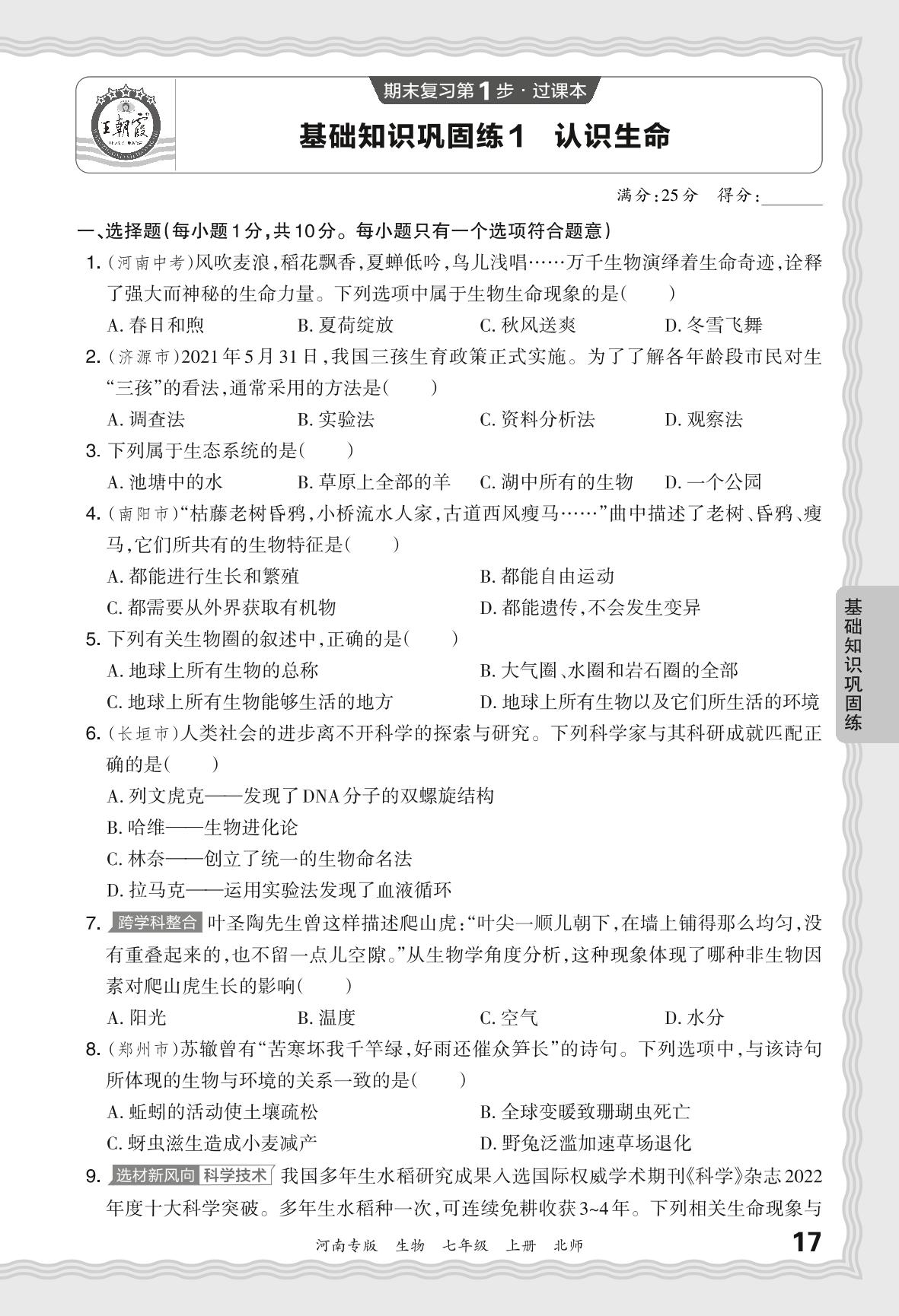 2023秋上册七年级生物北师版 期末过课本·基础知识巩固练 认识生命【1】