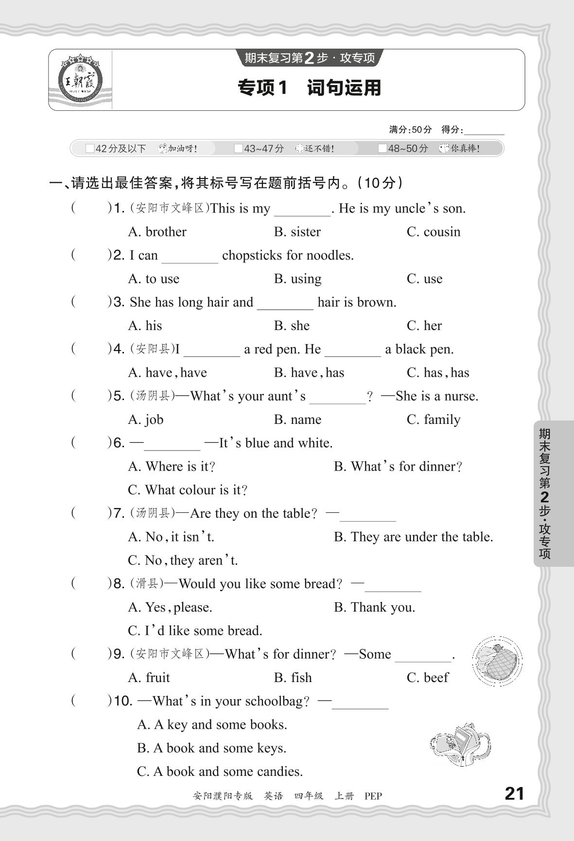 2023秋上册四年级英语人教PEP版 期末专项卷·词句运用【1】
