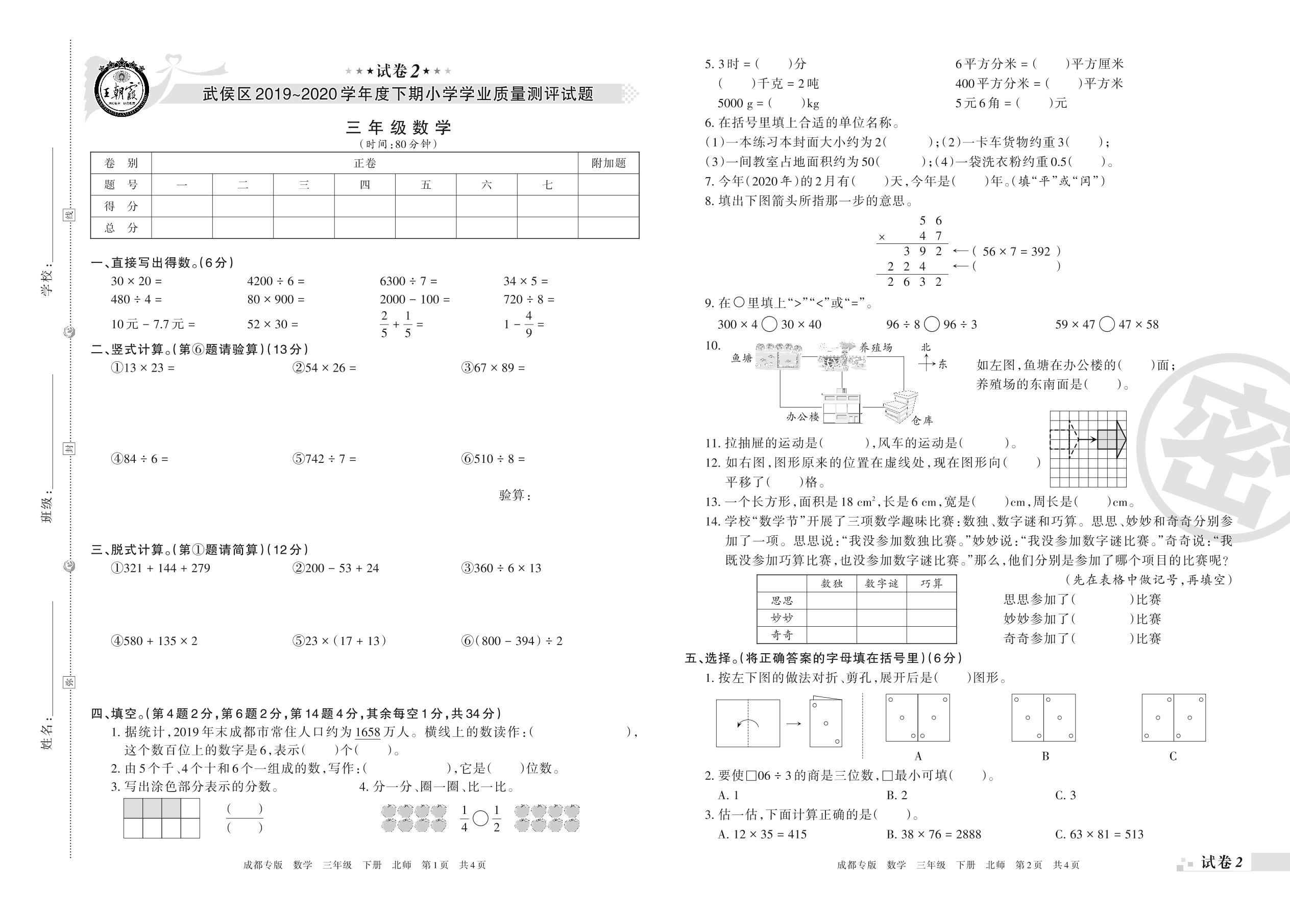 2019-2020学年第二学期成都市武侯区三年级数学试卷(北师版)【2】