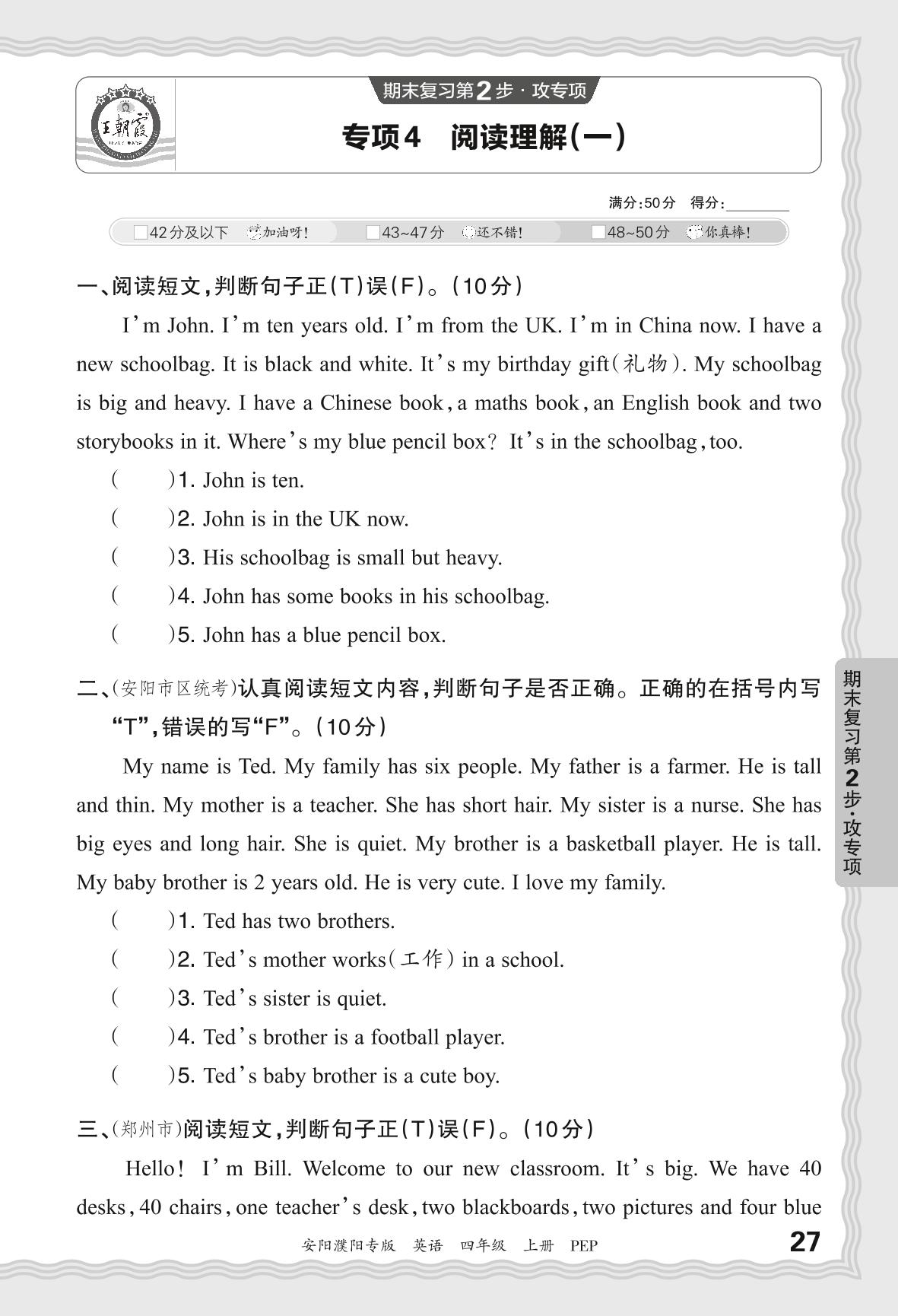 2023秋上册四年级英语人教PEP版 期末专项卷·阅读理解(一)【4】