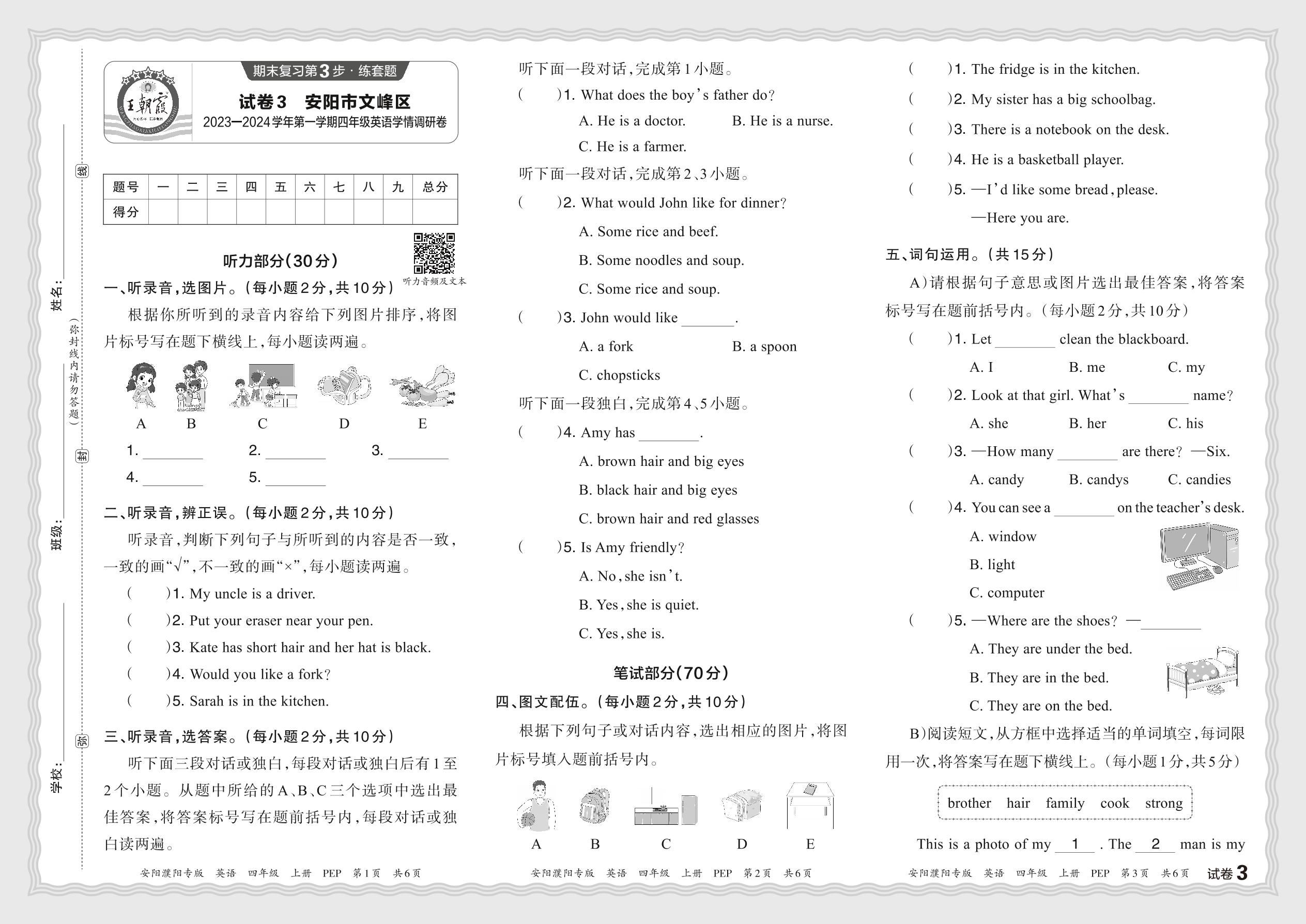 河南省安阳市文峰区2023—2024 学年第一学期四年级英语学情调研卷(人教PEP版)【3】
