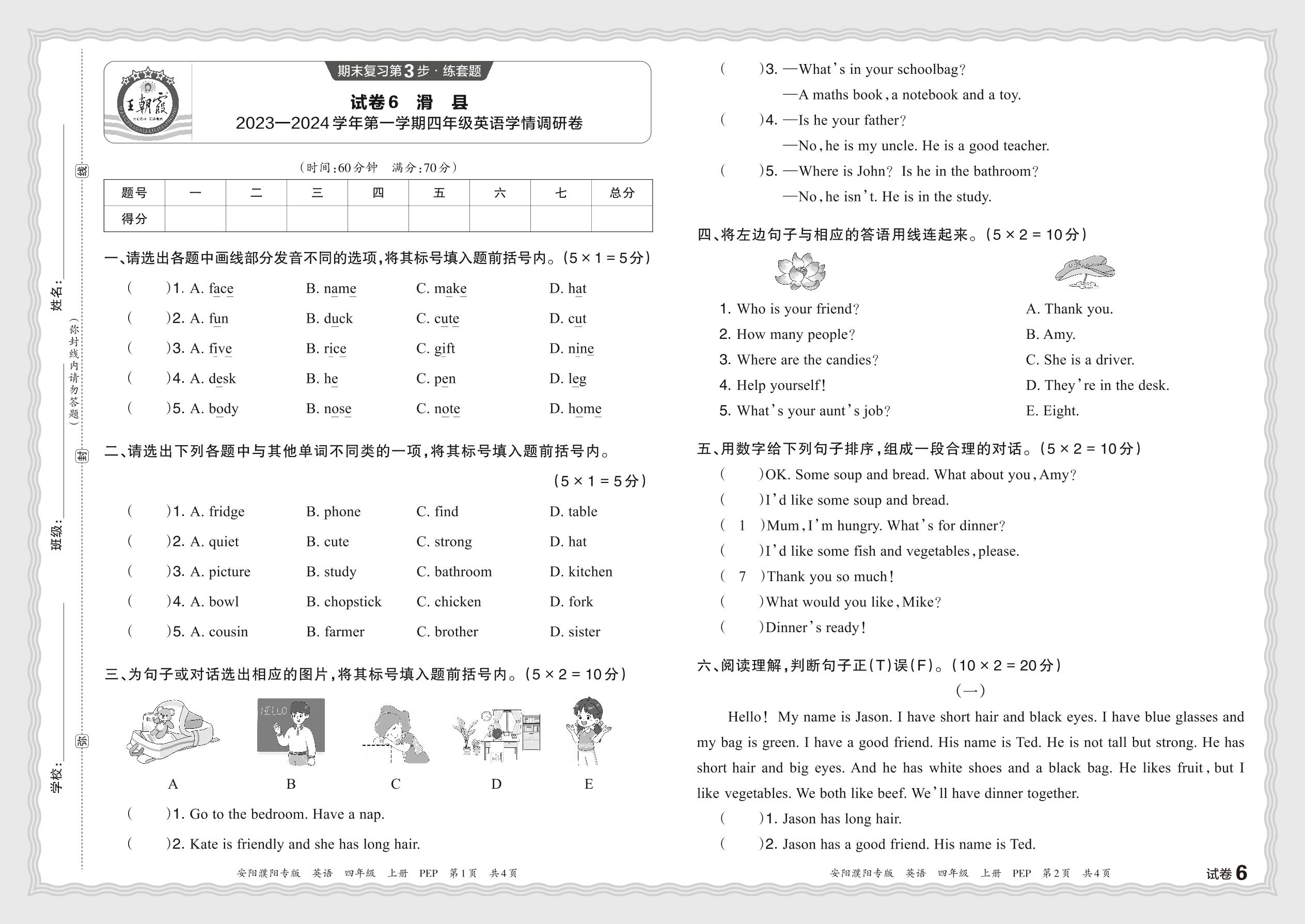 河南省安阳市滑县2023—2024 学年第一学期四年级英语学情调研卷(人教PEP版)【6】