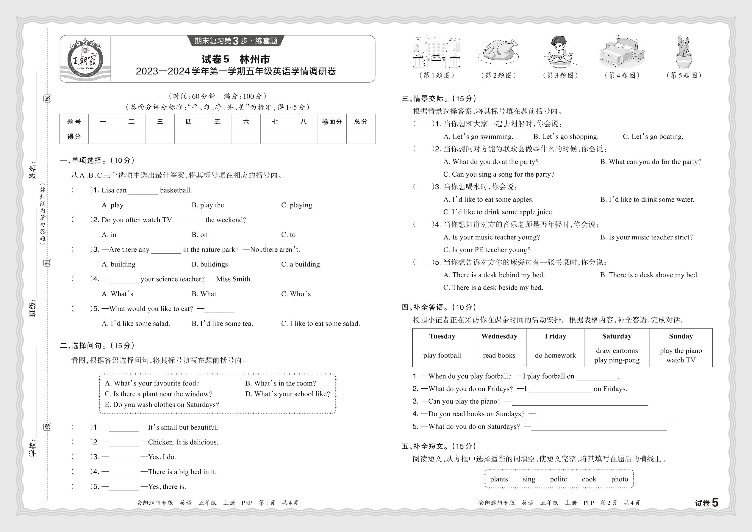 河南省安阳市林州市2023—2024学年第一学期五年级英语学情调研卷(人教PEP版)【5】