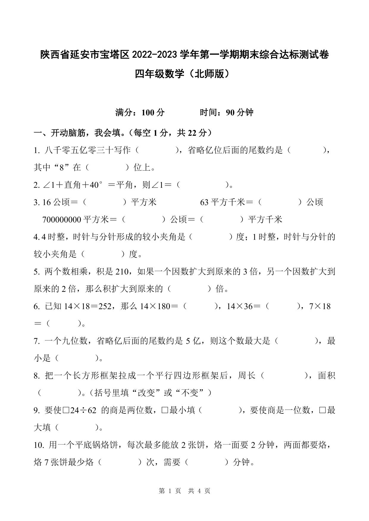 陕西省延安市宝塔区2022-2023学年第一学期期末综合达标测试卷四年级数学(北师版)