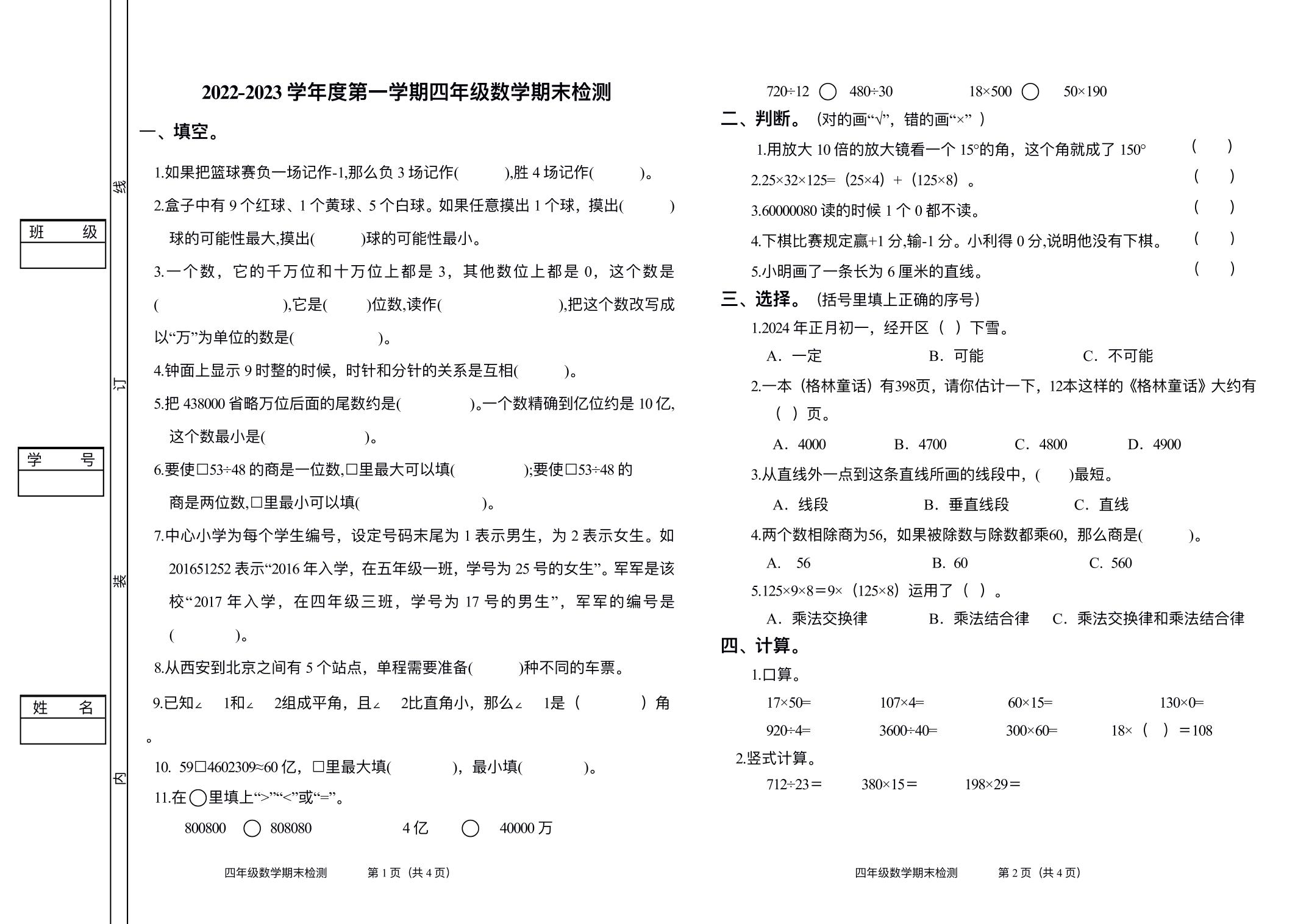 陕西省西安市经开第五小学2022-2023学年度第一学期期末检测试卷四年级数学(北师版)