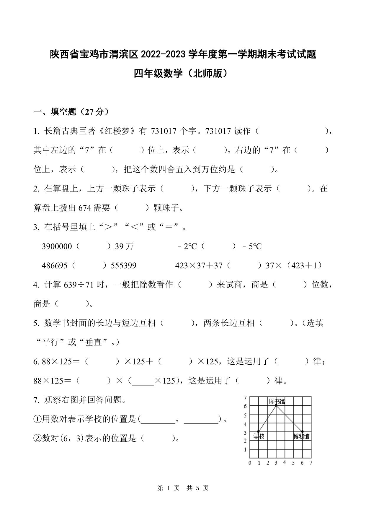陕西省宝鸡市渭滨区2022-2023学年度第一学期期末考试试题四年级数学(北师版)