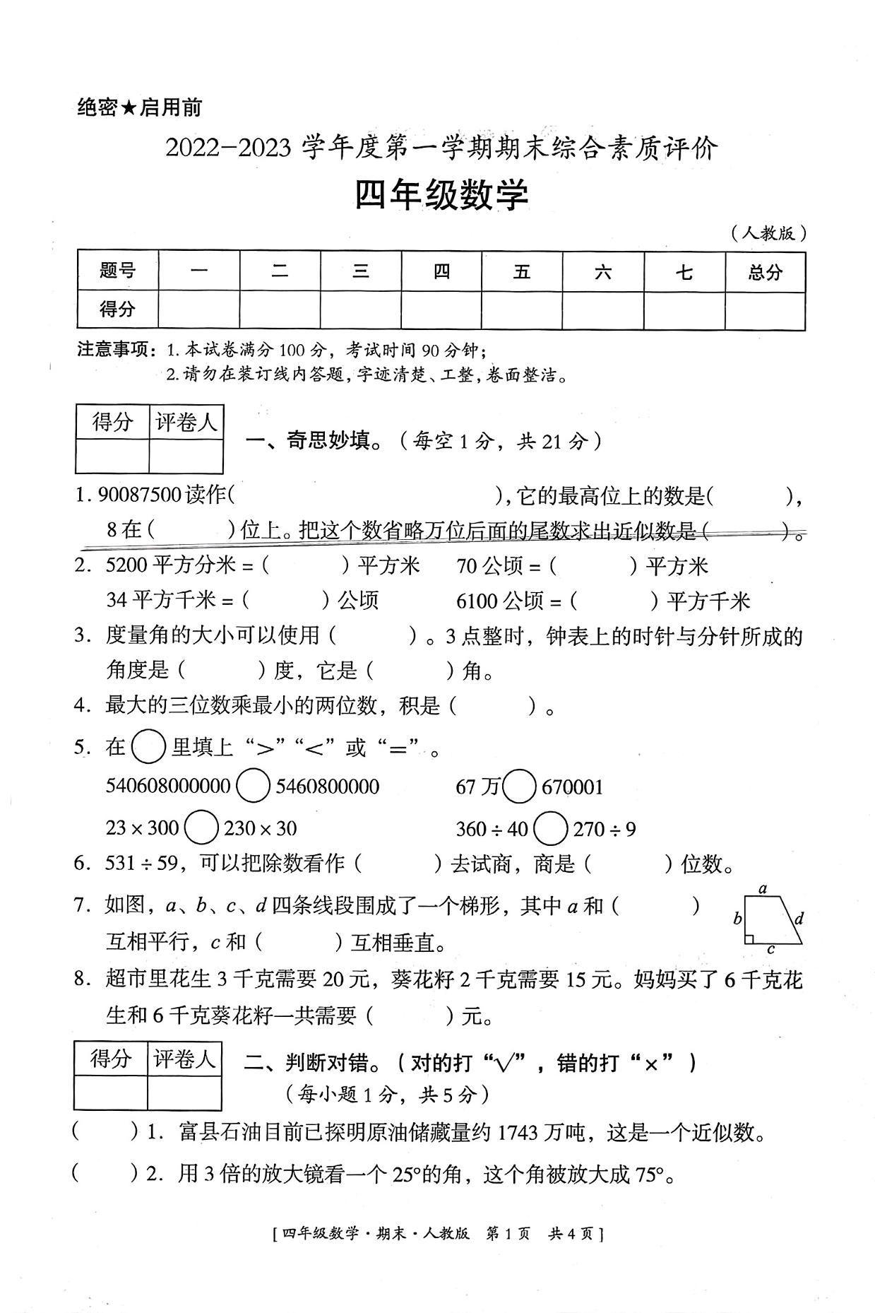 陕西省延安市富县2022-2023学年度第一学期期末综合素质评价四年级数学(人教版)