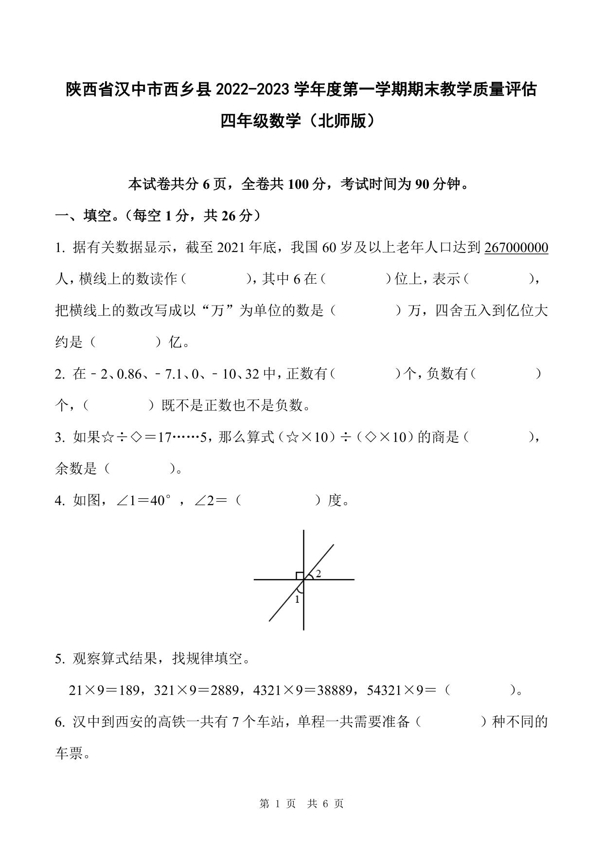 陕西省汉中市西乡县2022-2023学年度第一学期期末教学质量评估四年级数学(北师版)