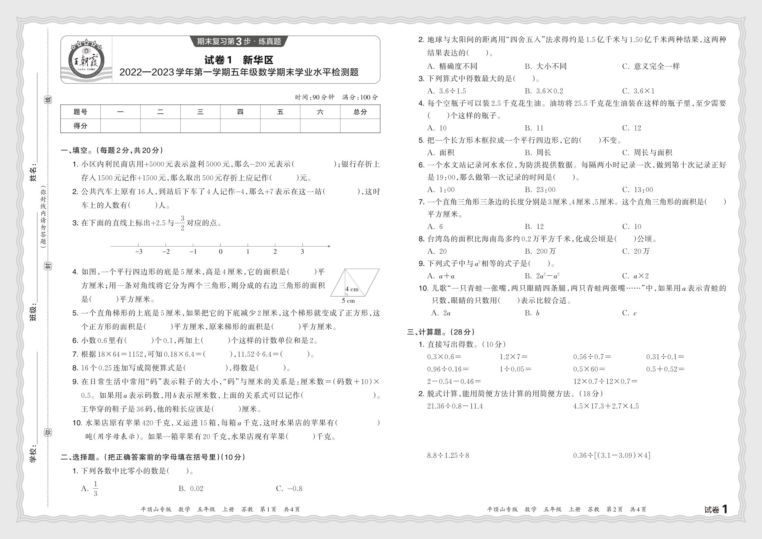河南省平顶山市新华区2022—2023学年第一学期五年级数学期末试卷(苏教版)【1】