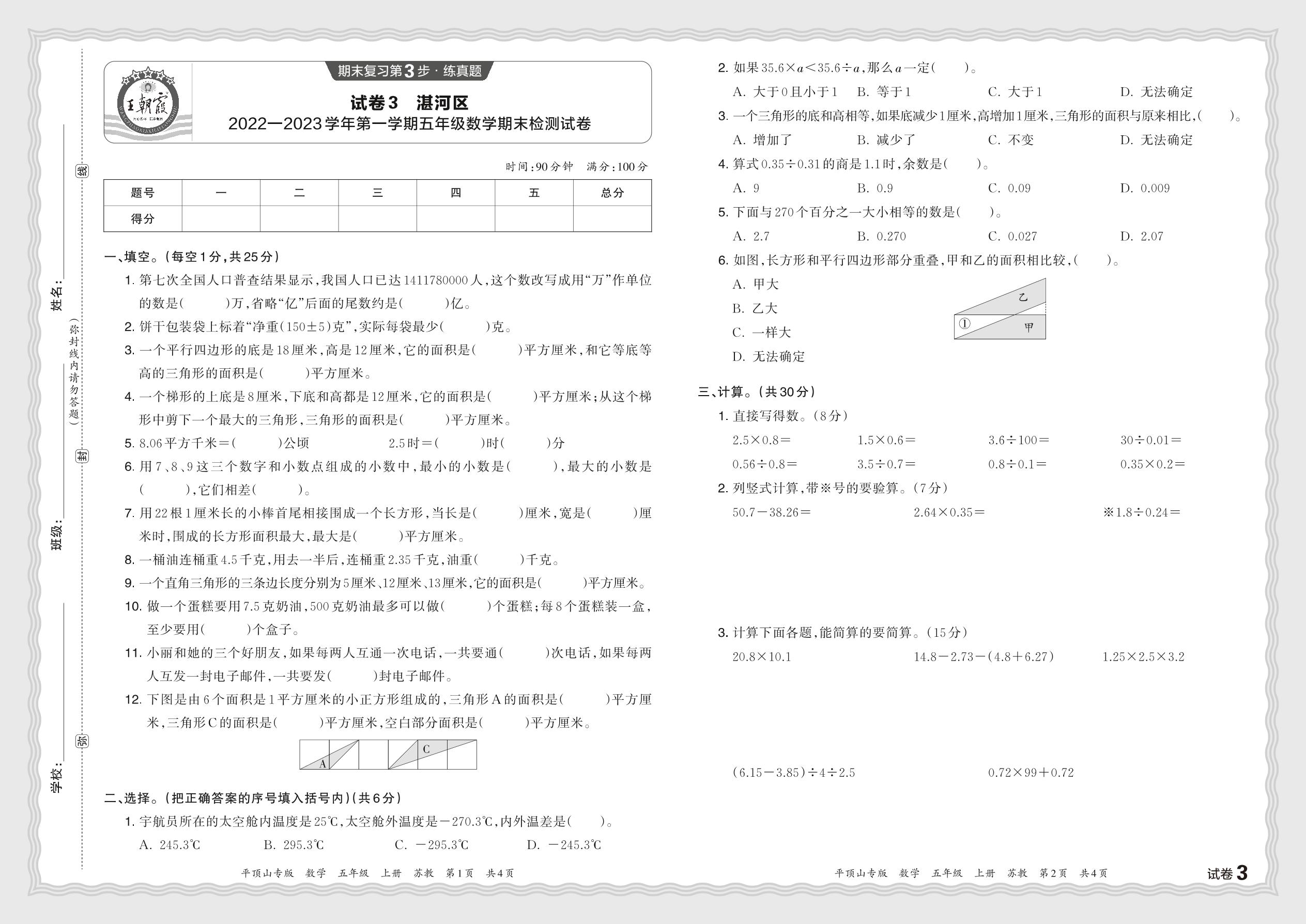 五年级数学苏教版上册期末卷