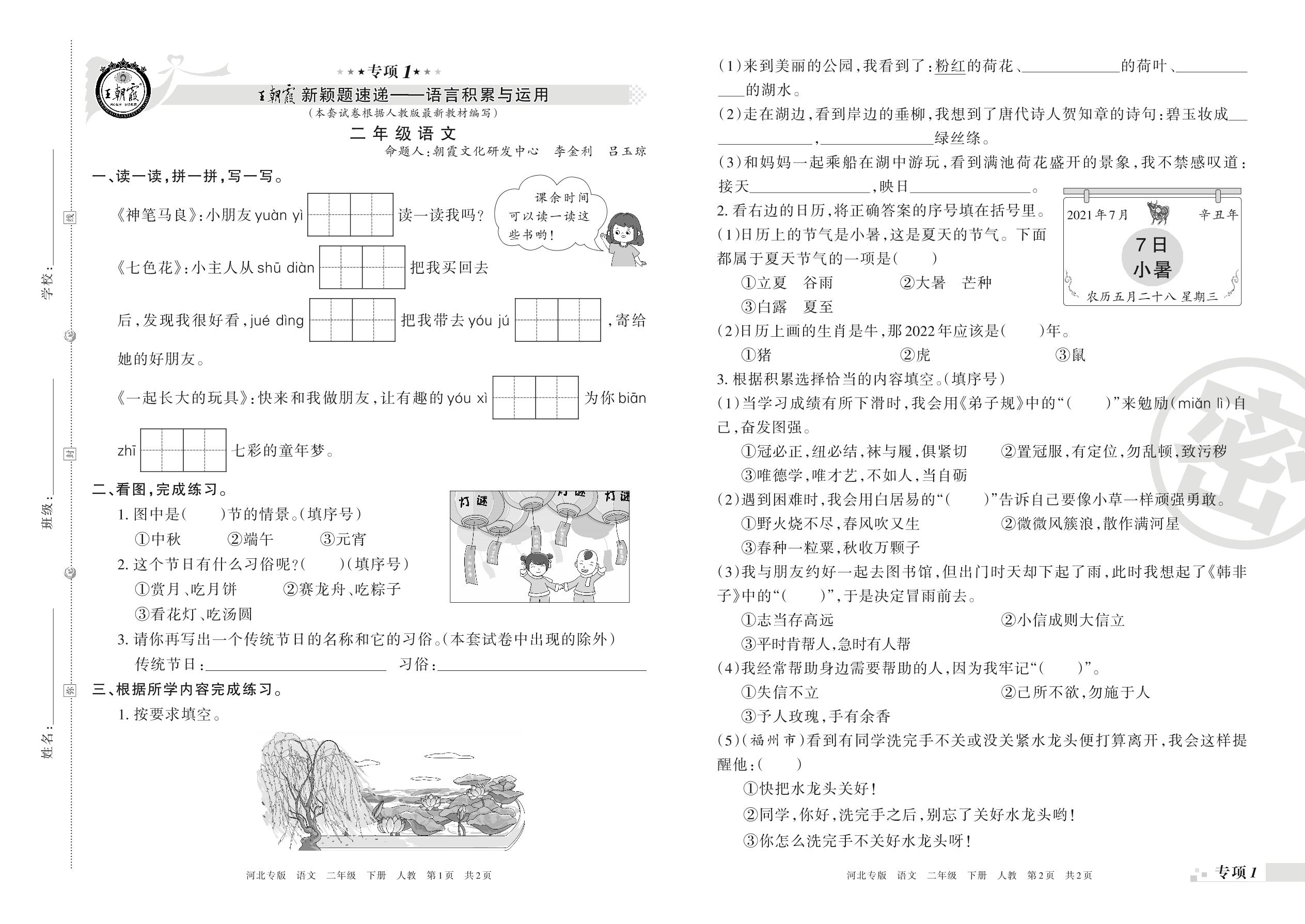 王朝霞期末专项卷——语言积累与运用、句子与口语交际真题归类复习二年级下册语文(人教版)_R21080163853【0】