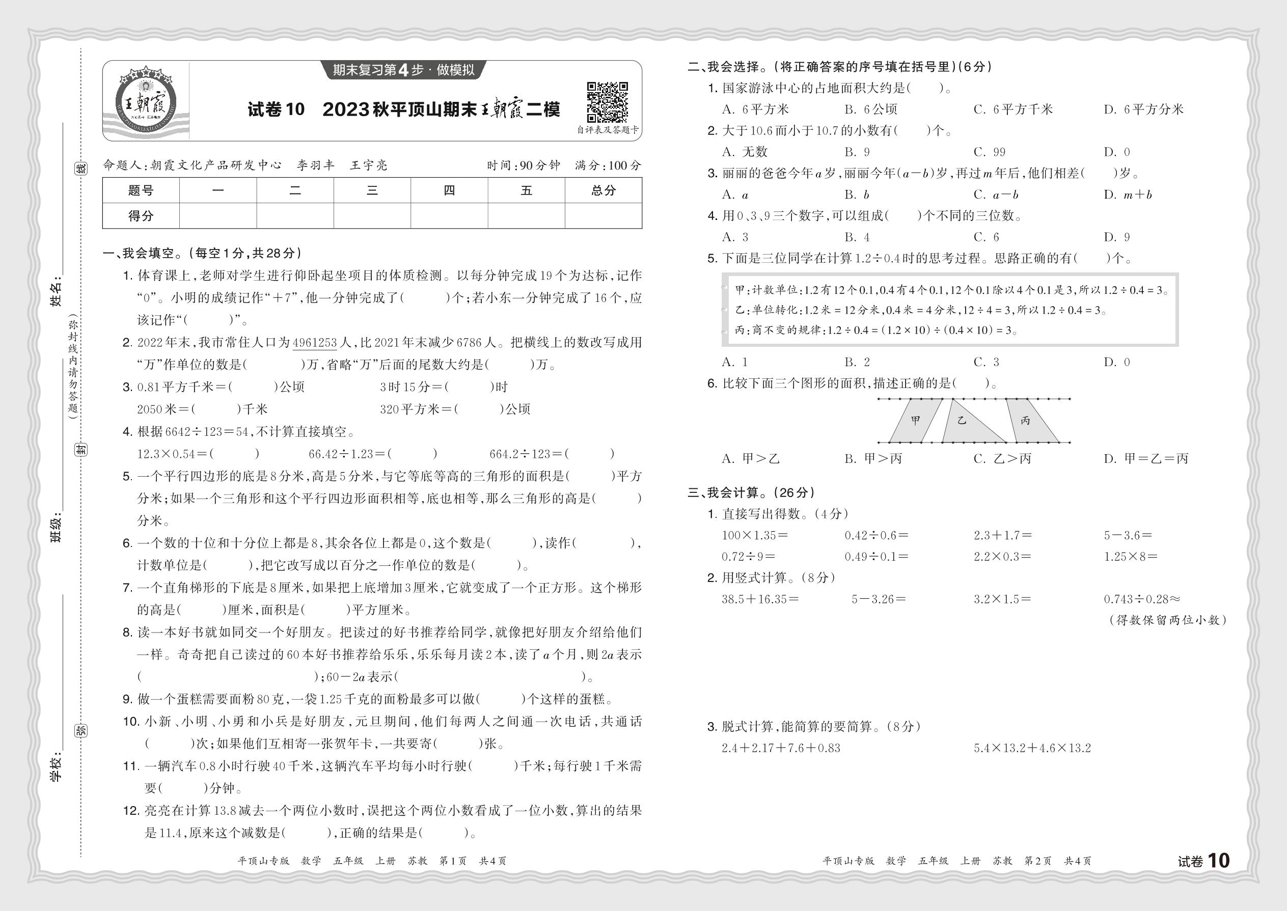 2023秋上册五年级数学苏教版 河南平顶山期末王朝霞二模【10】