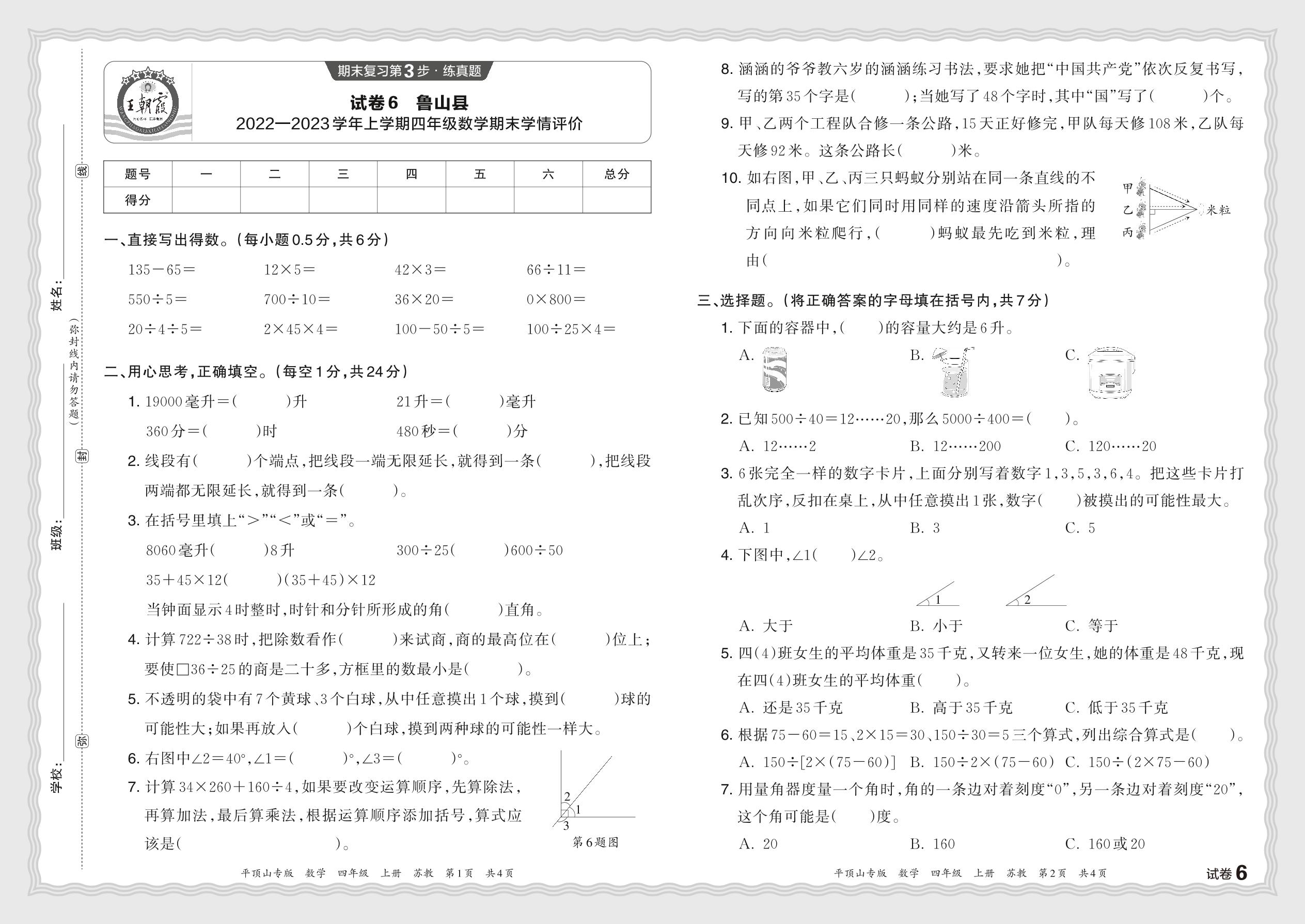 河南省平顶山市鲁山县2022—2023学年上学期四年级数学期末学情评价(苏教版)【6】