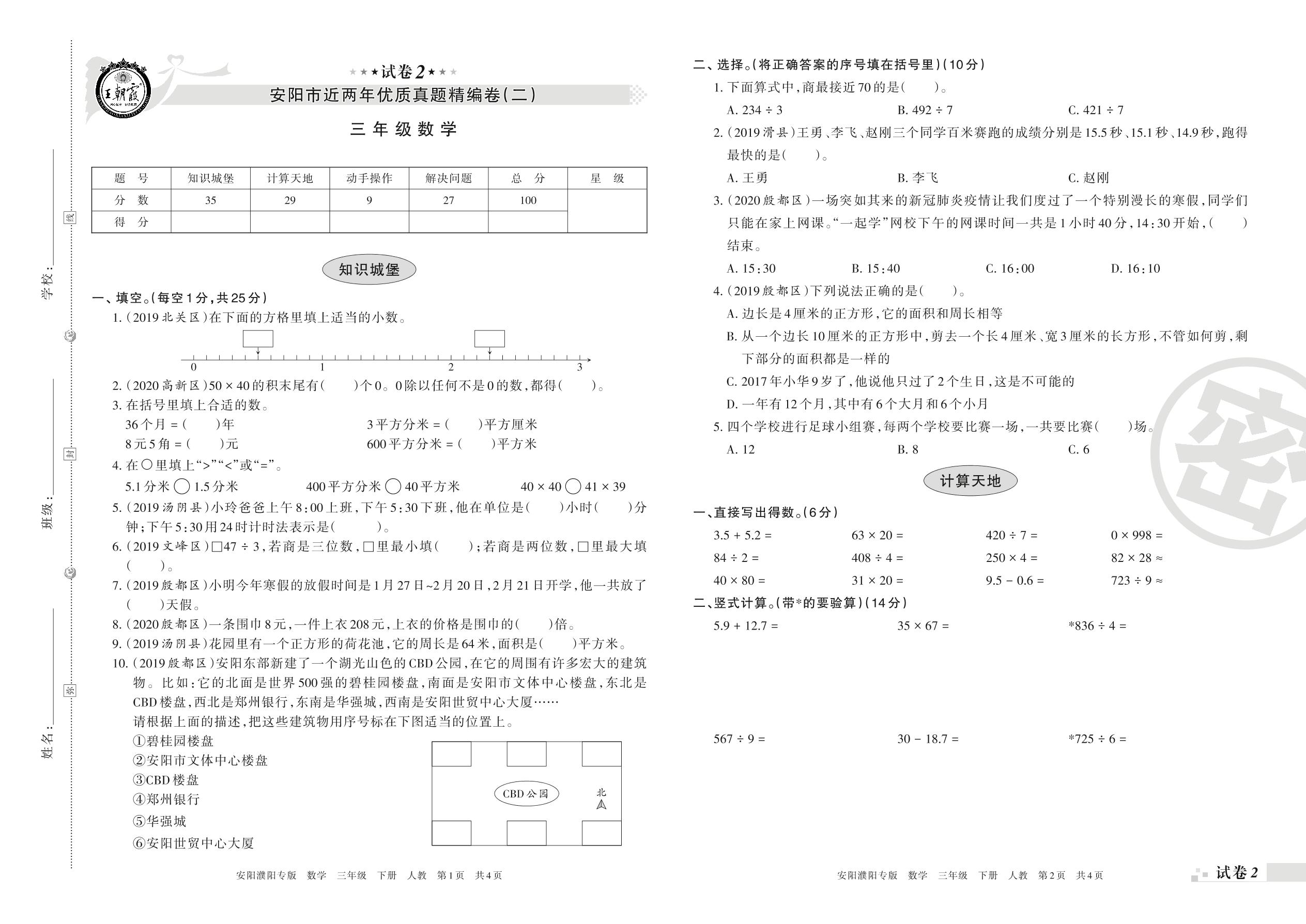 安阳市近两年优质真题精编卷(二)三年级下册数学(人教版)【2】