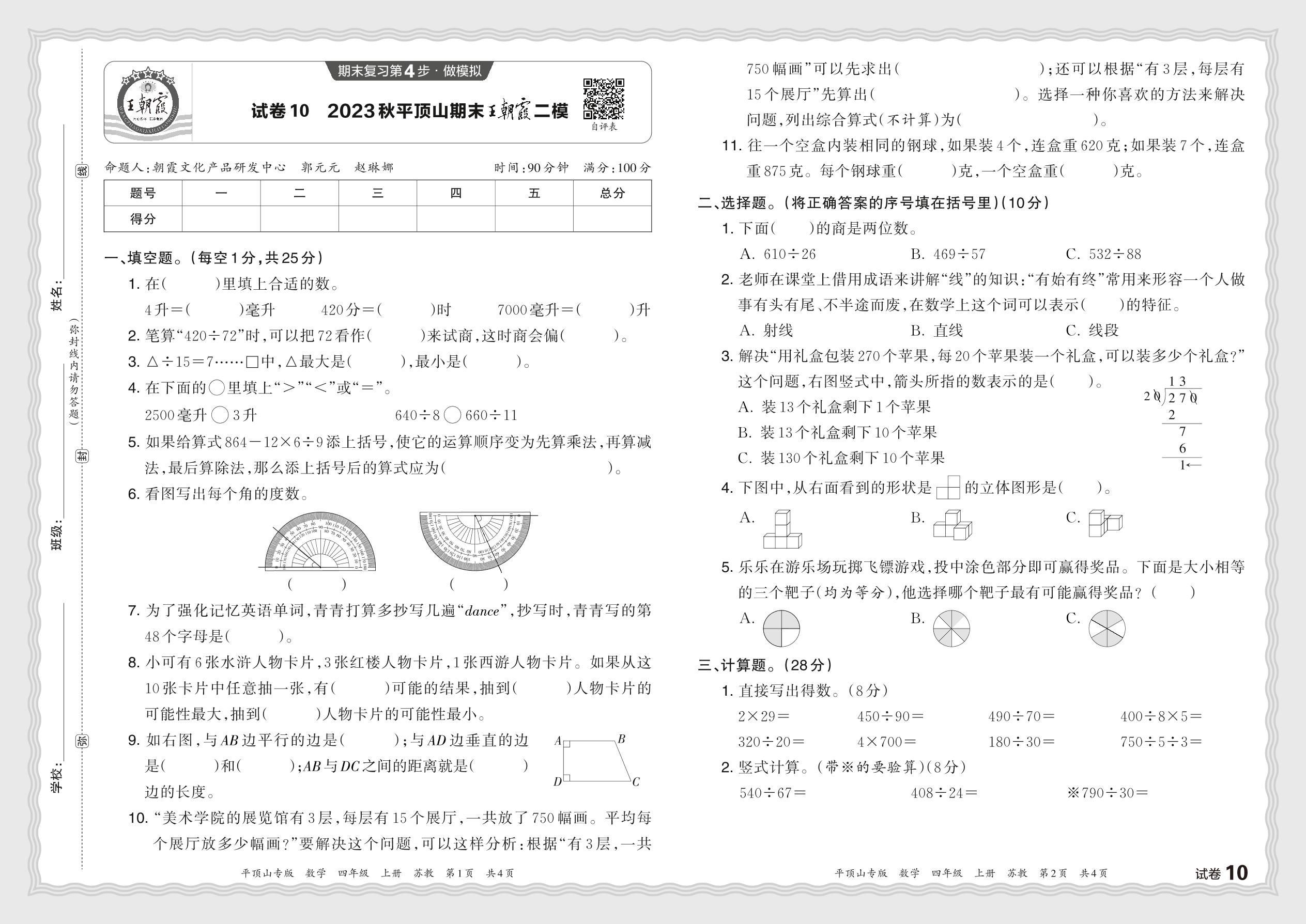 2023秋上册四年级数学苏教版 河南平顶山期末王朝霞二模【10】