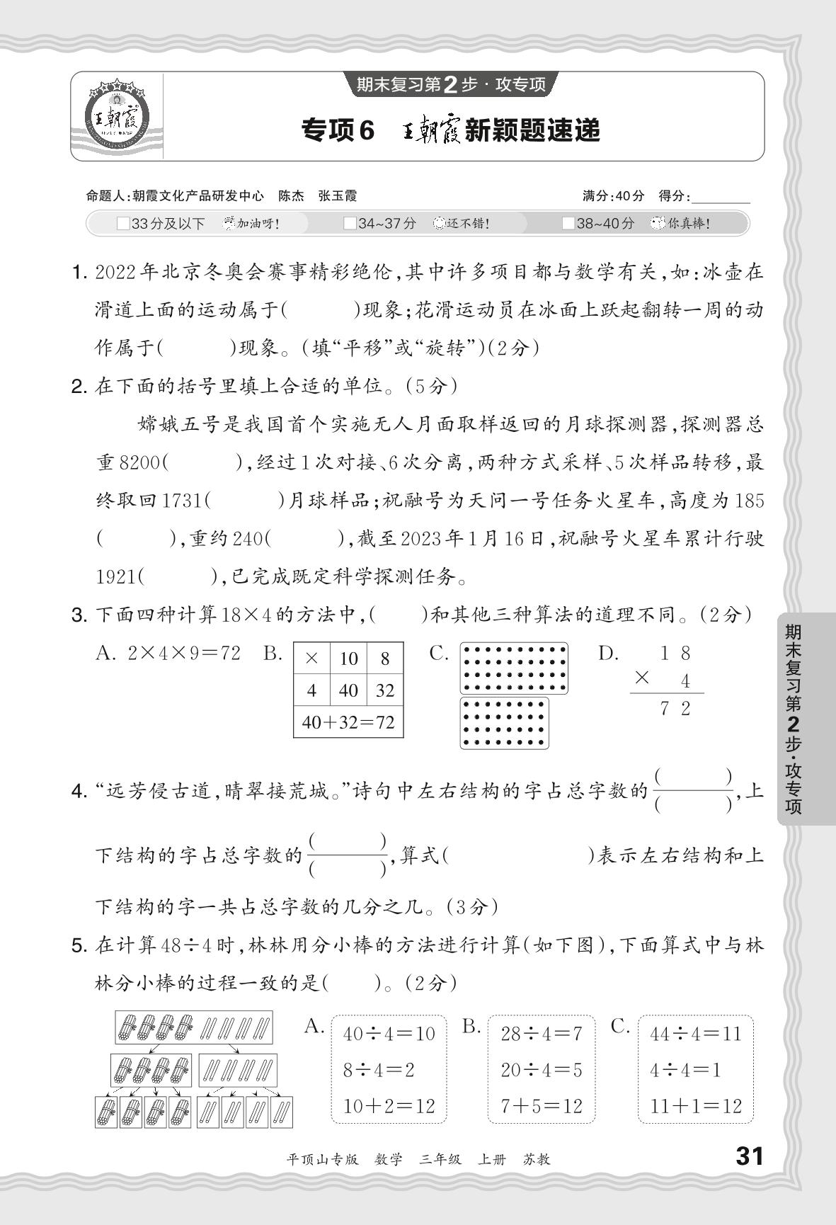 2023秋上册三年级数学苏教版 期末专项卷·王朝霞新颖题速递【6】