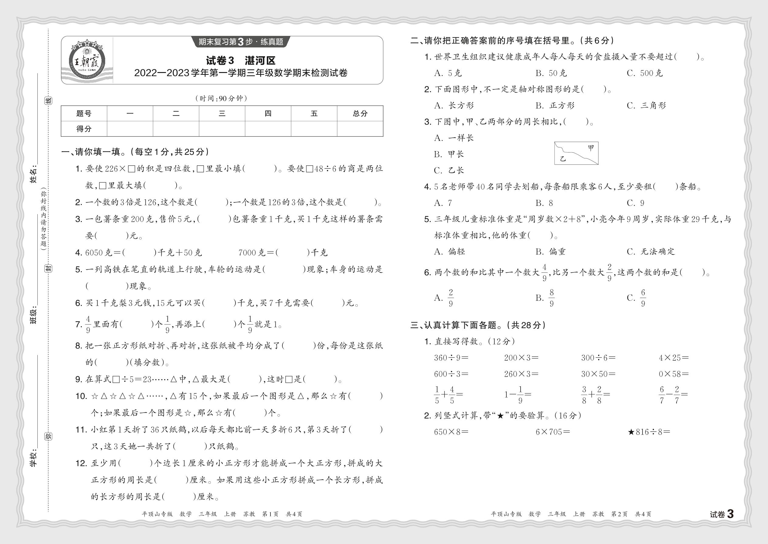 河南省平顶山市湛河区2022—2023学年第一学期小学三年级数学期末检测题(苏教版)【3】
