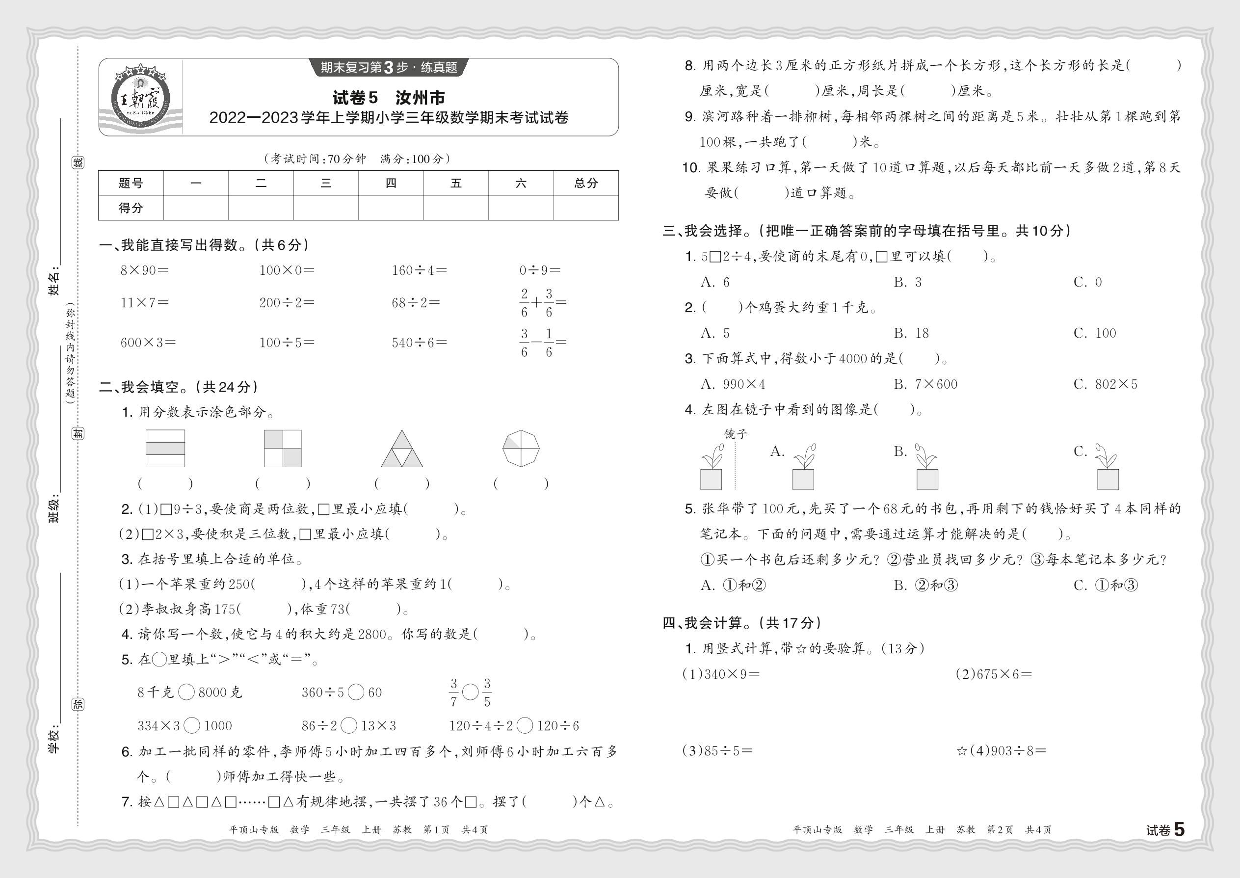 三年级数学苏教版上册期末卷