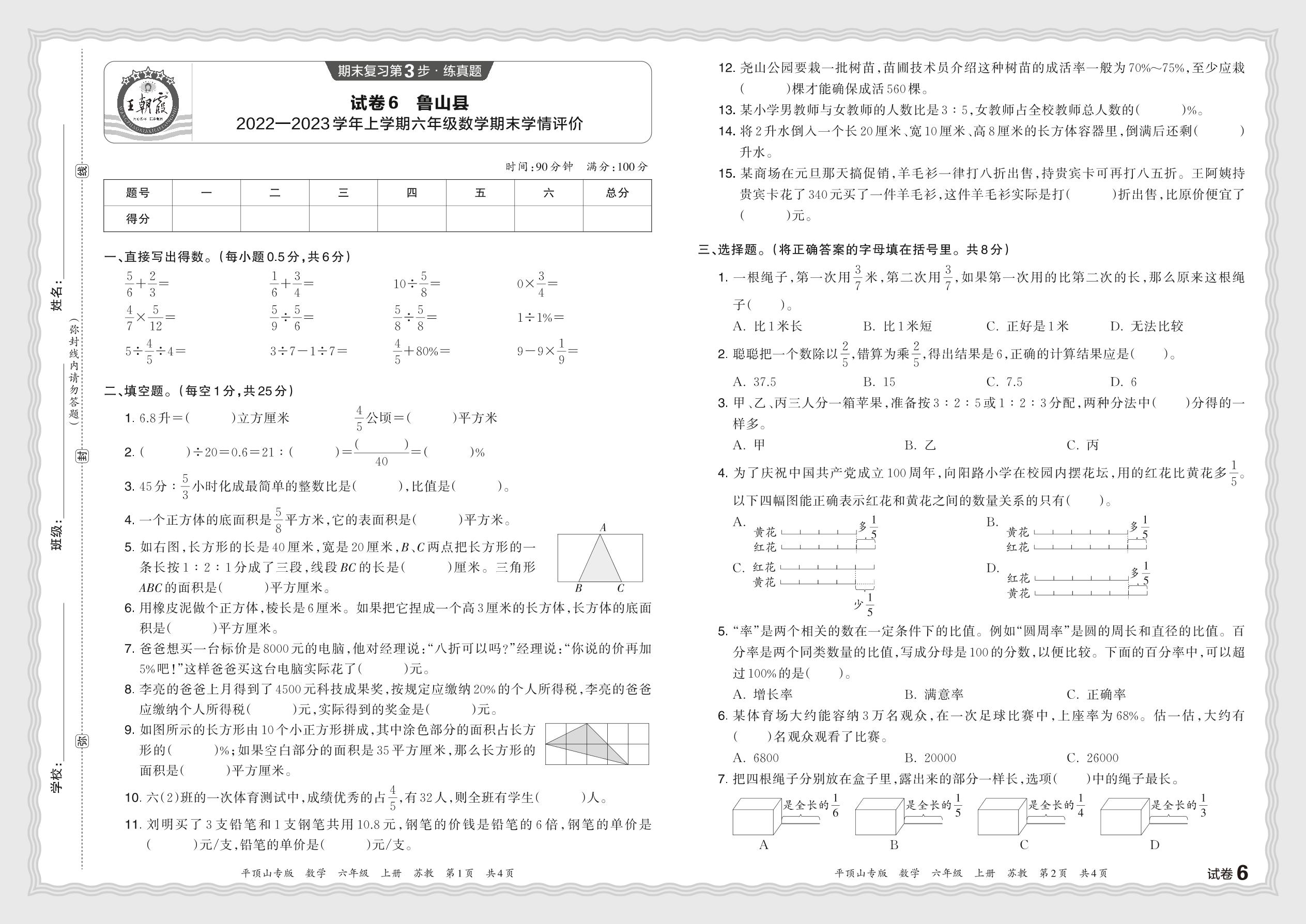 河南省平顶山市鲁山县2022—2023学年上学期六年级数学期末学情评价(苏教版)【6】