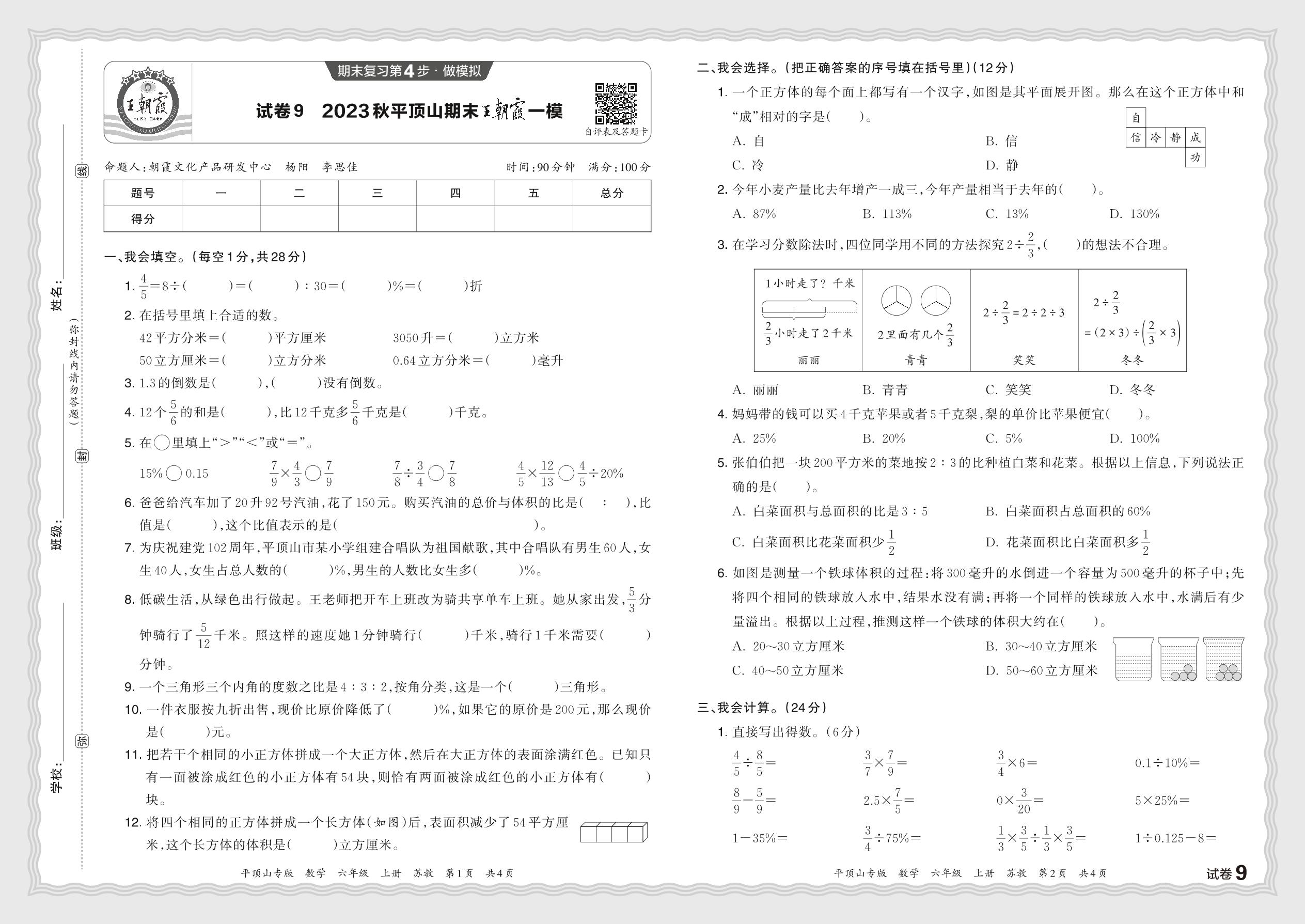 2023秋上册六年级数学苏教版 河南平顶山期末王朝霞一模【9】