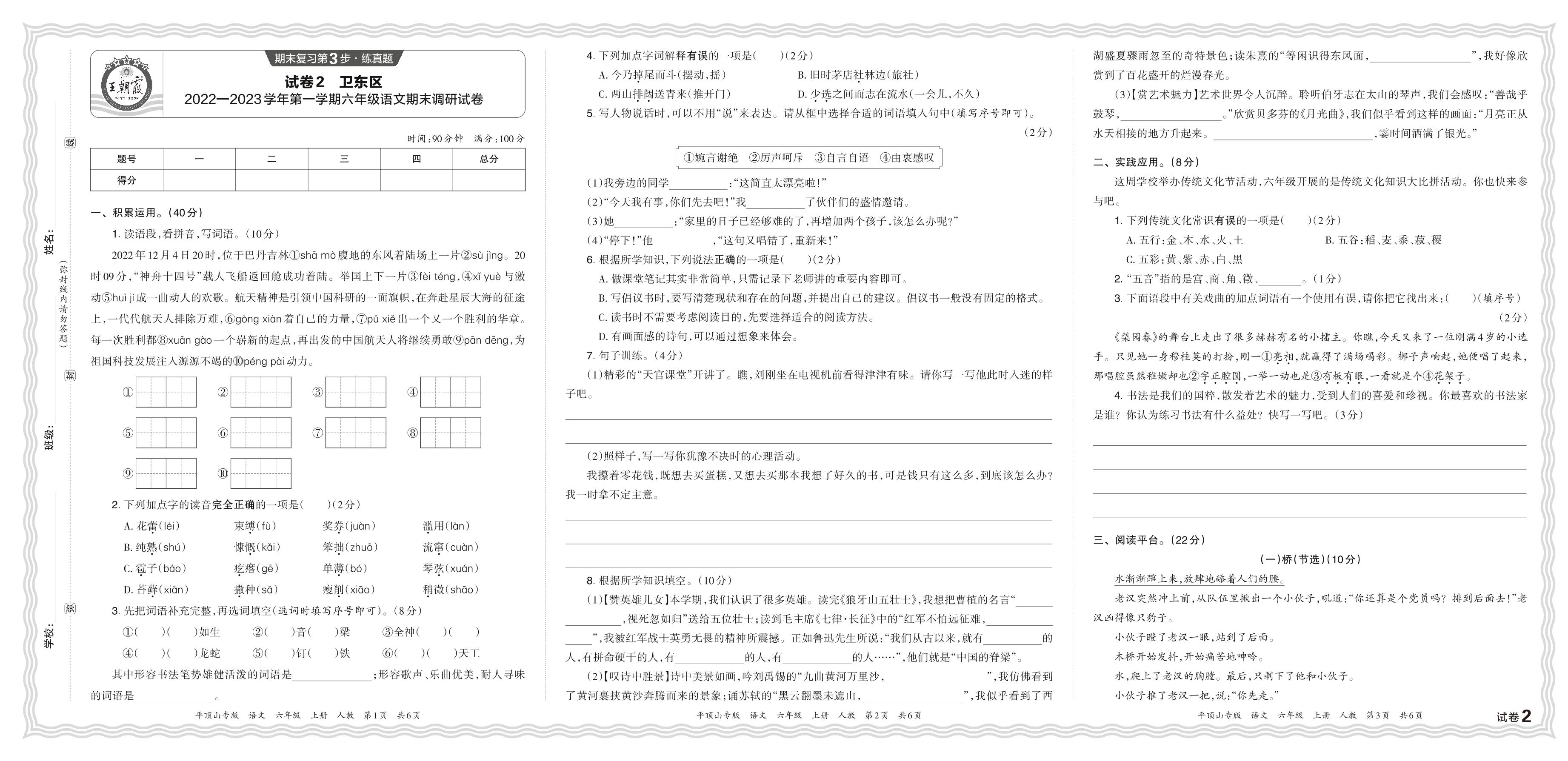 河南省平顶山市卫东区2022—2023学年第一学期六年级语文期末调研试卷(人教版)【2】