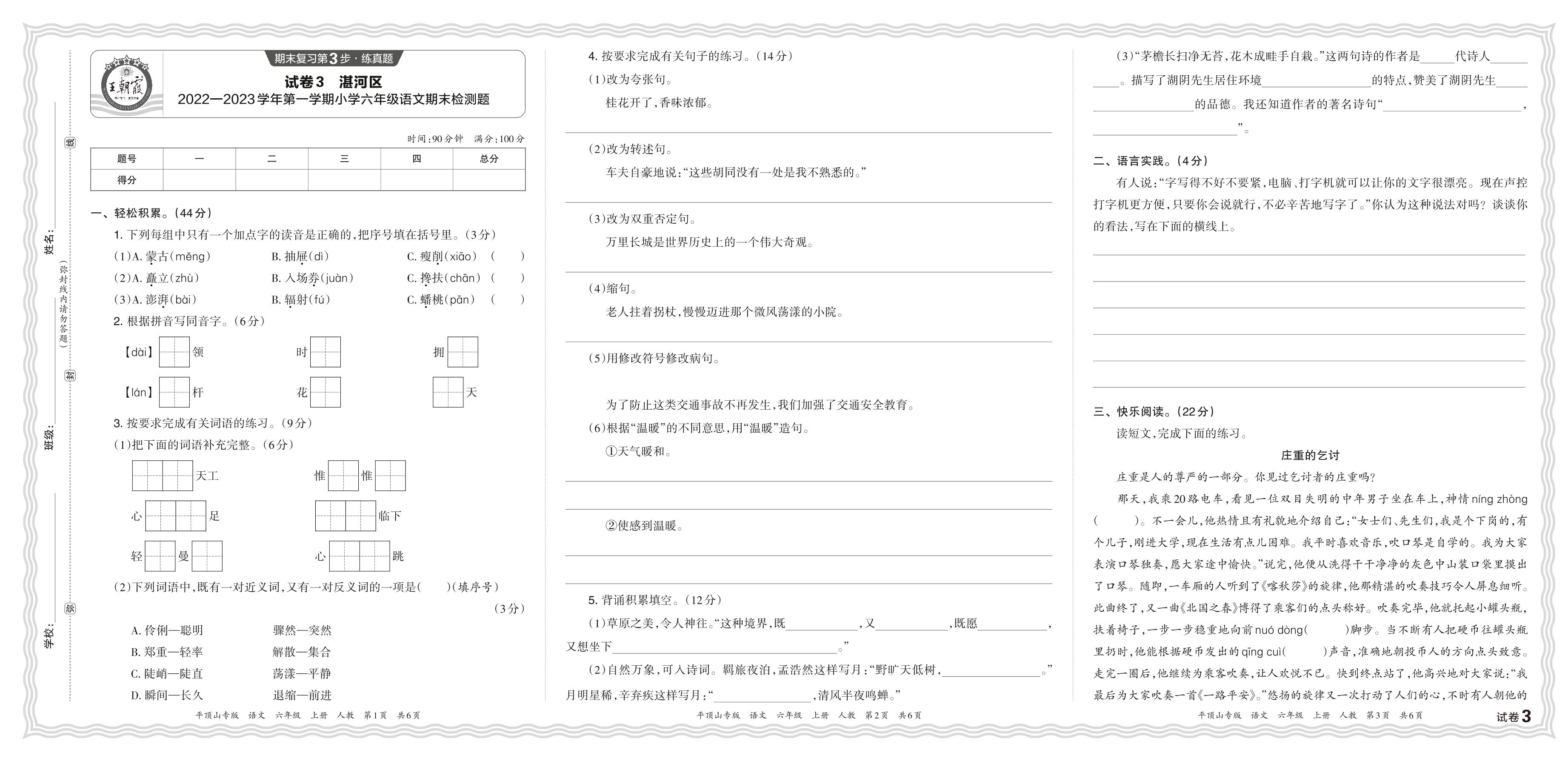 河南省平顶山市湛河区2022—2023学年第一学期小学六年级语文期末检测题(人教版)【3】
