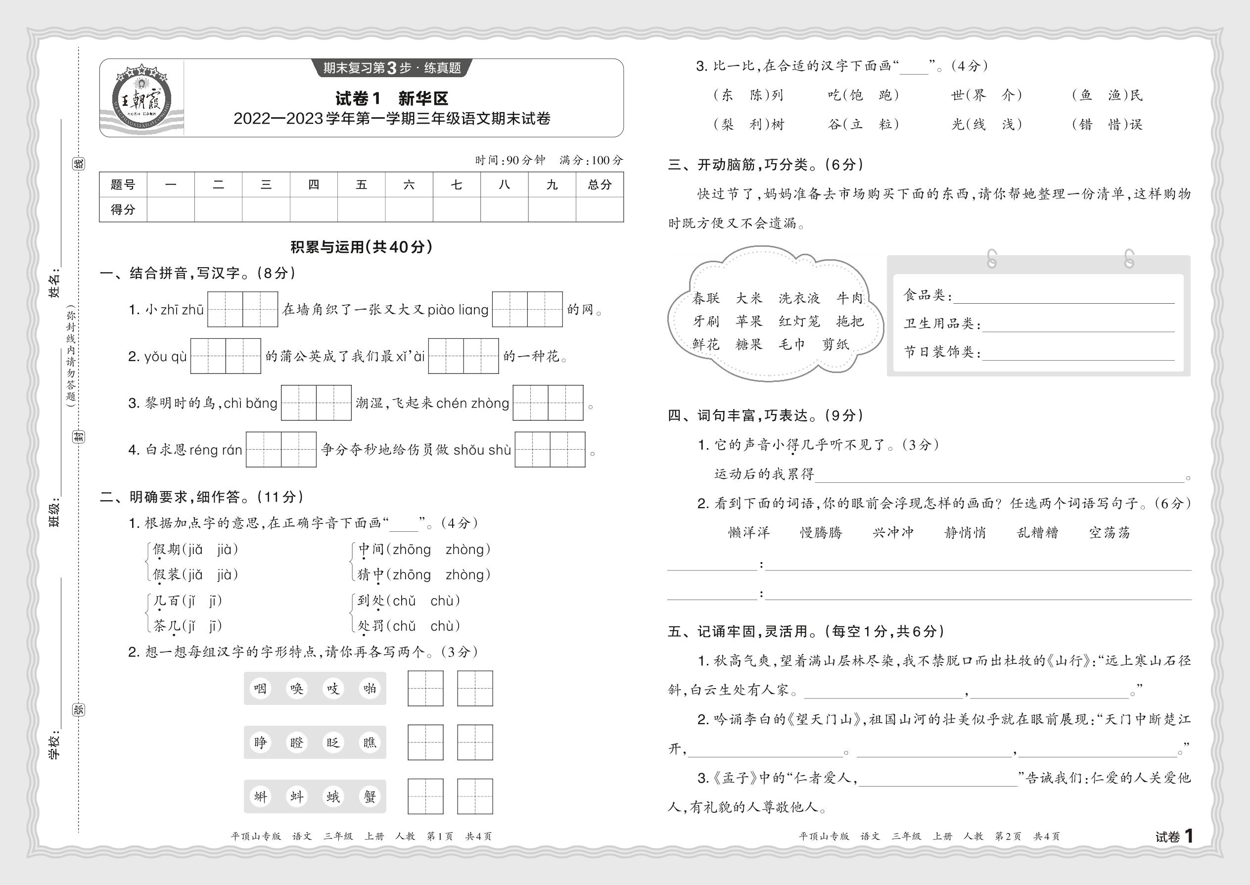 河南省平顶山市新华区2022—2023学年第一学期三年级语文期末试卷(人教版)【1】